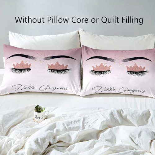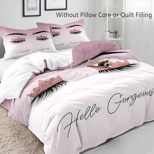 VIVIHOME 3PCS Hello Gorgeous Bedding Set, Duvet Cover Queen, Silver Glitter Bling Makeup Eyelash Girly Fashion Glam Pink Bedding, Comforter Cover Pink Room Decor Bedroom Decor for Women, 2 Pillowcases