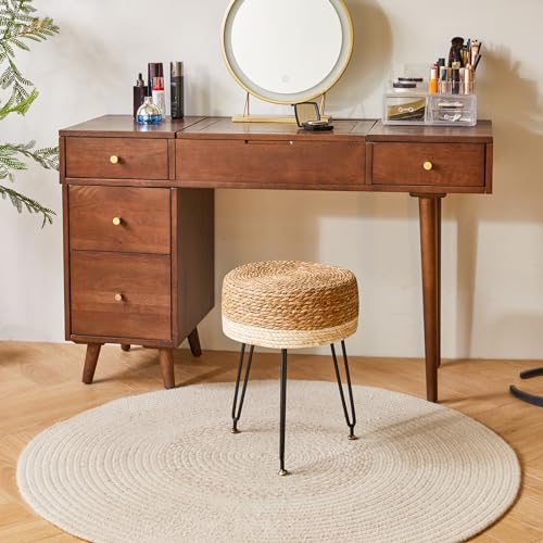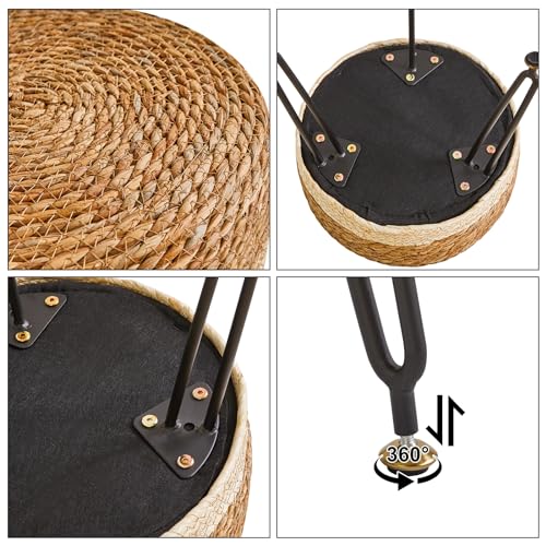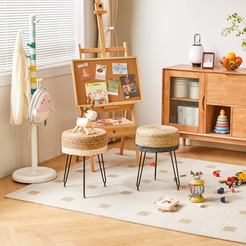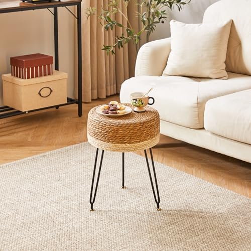 YMYNY Footstool Natural Seagrass Hand Weave, Vanity Makeup Stool, Pastoral Style, Padded Foot Rest with Metal Legs, Foot Rest Sofa Stool, for Living Room, 12.59"L×12.59"W×17.71"H Natural&Blue UHBD029Q