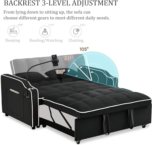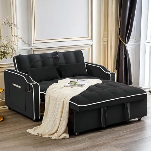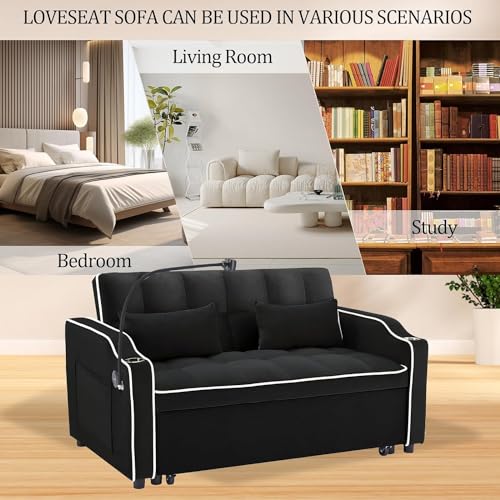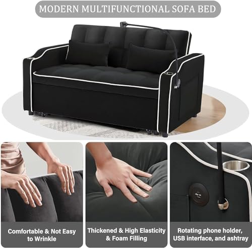 3 in 1 Sleeper Sofa Couch Bed, Velvet Convertible Loveseat Sleeper Sofa with USB Port and Ashtray and Swivel Phone Stand, Storage Pockets, Pull Out Loveseat Sleeper for Living Room, Grey