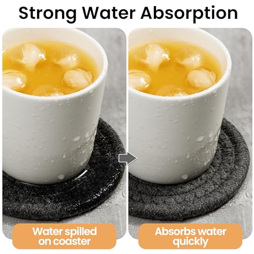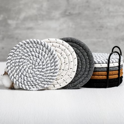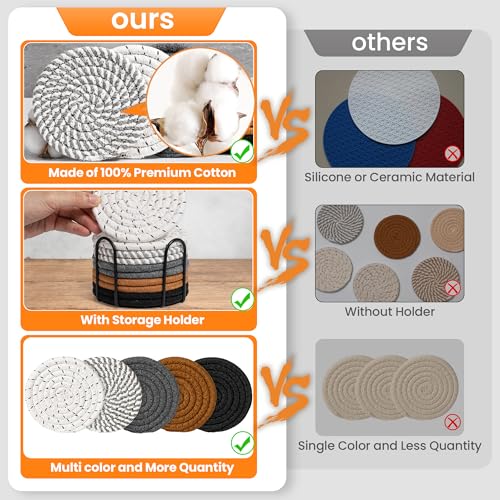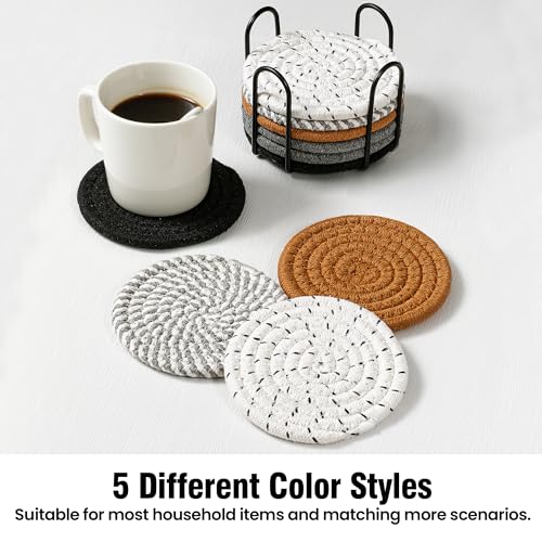 10 Pcs Drink Coasters with Holder, 5 Colors Absorbent Coasters for Drinks 4.3 Inch Cup Coasters Minimalist Cotton Coaster Set Woven Coasters for Coffee Table Bar Home Decor Housewarming Gift