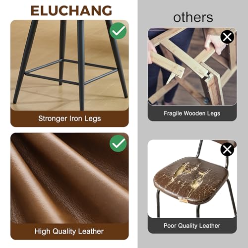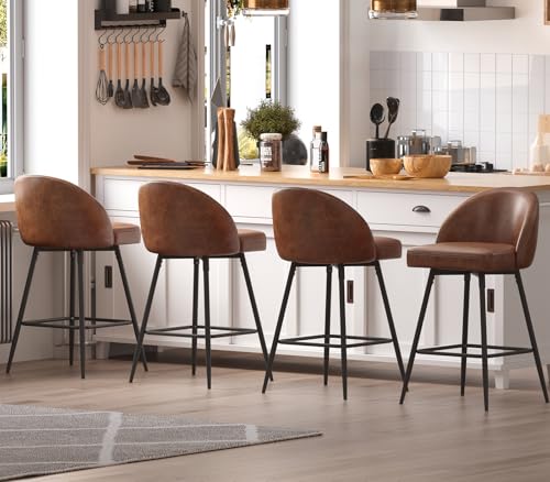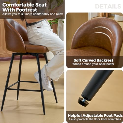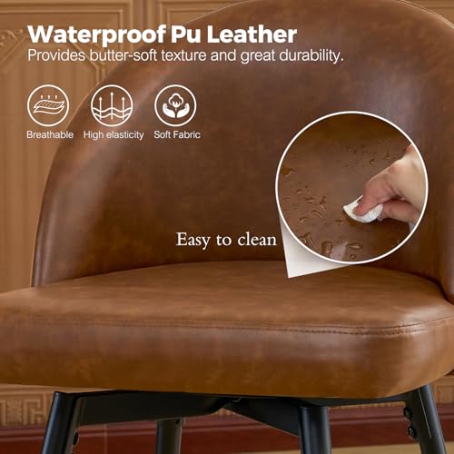 ELUCHANG 360° Swivel Counter Height Bar Stool Chairs Set of 4, Modern 27'' Upholstered Barstools with Back & Metal Frame, Counter Top Stools for Kitchen Island, Faux Leather, Dark Brown