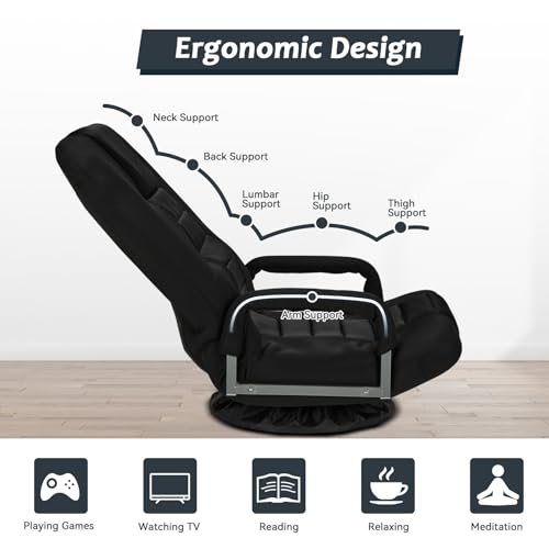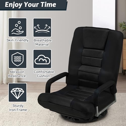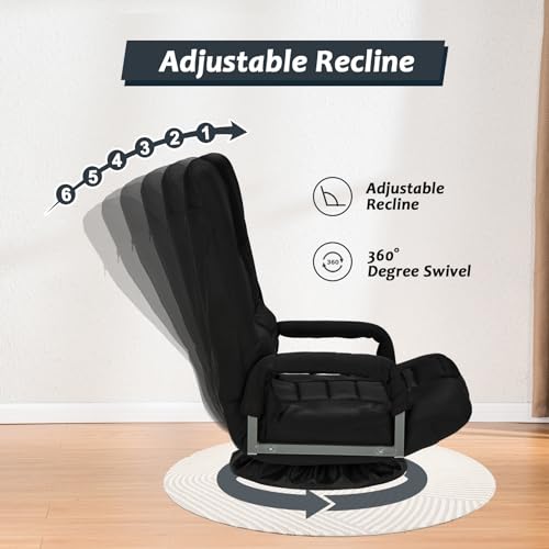 360 Degree Multipurpose Swivel Chair,Adjustable 6 Positions Backrest with Armrest,Folding Floor Chairs for Reading, Relaxing, Mediation,Black
