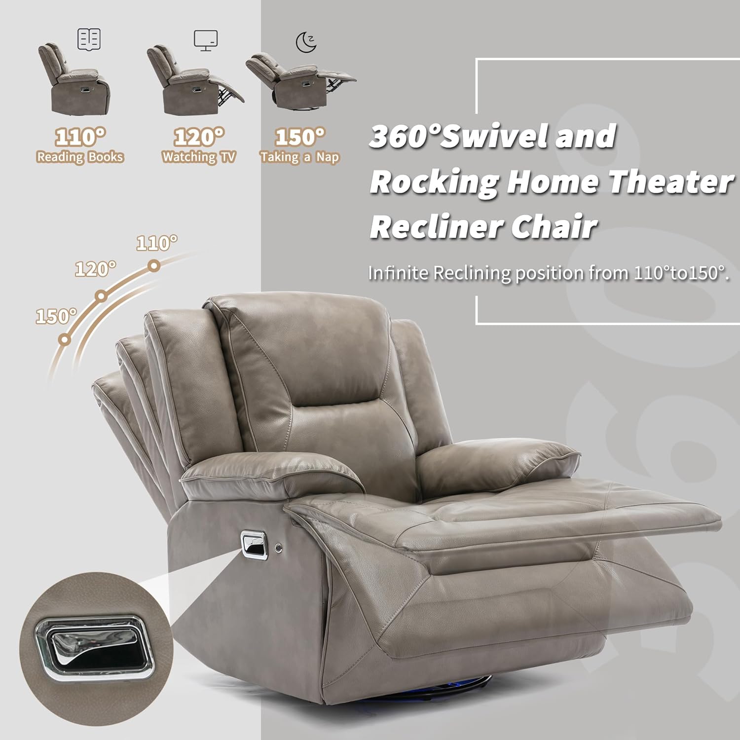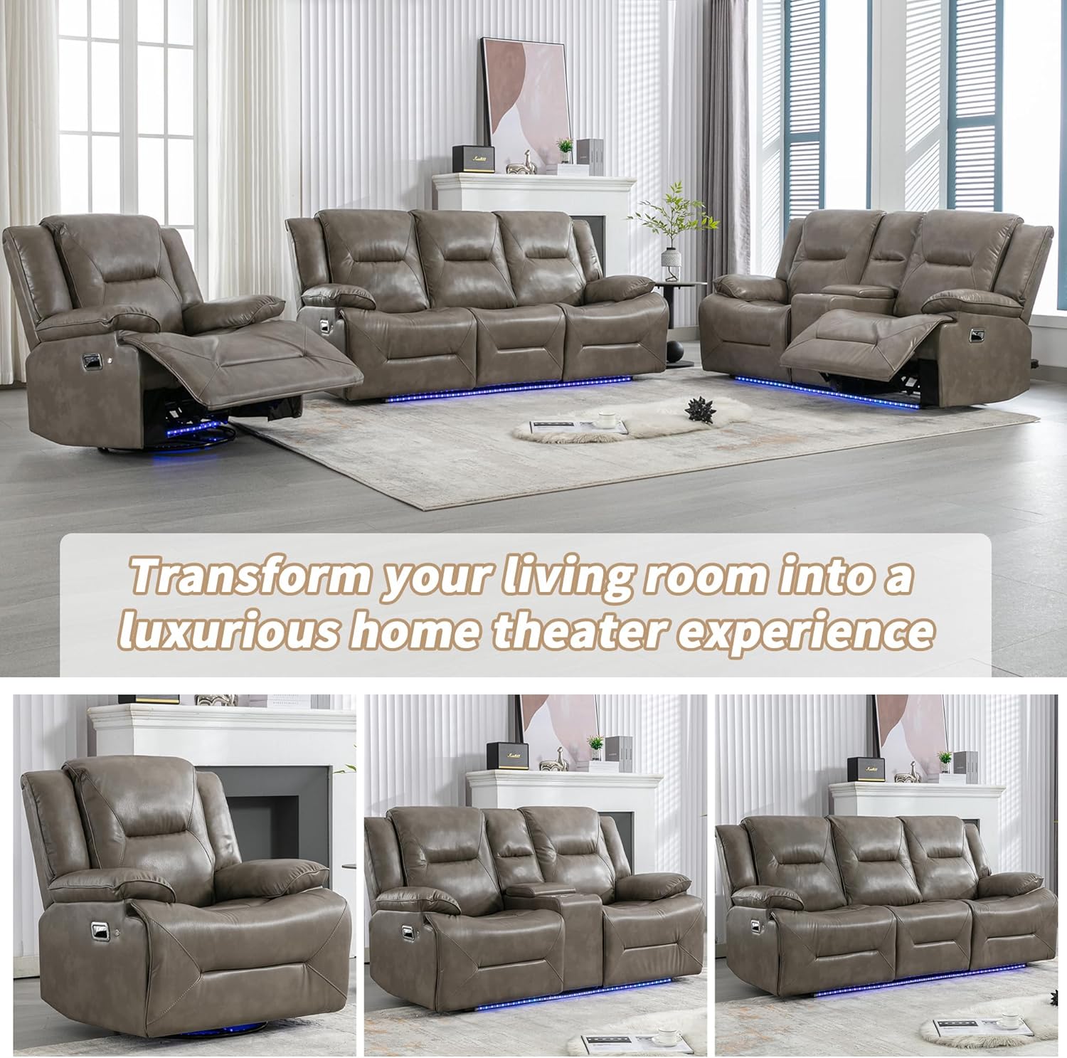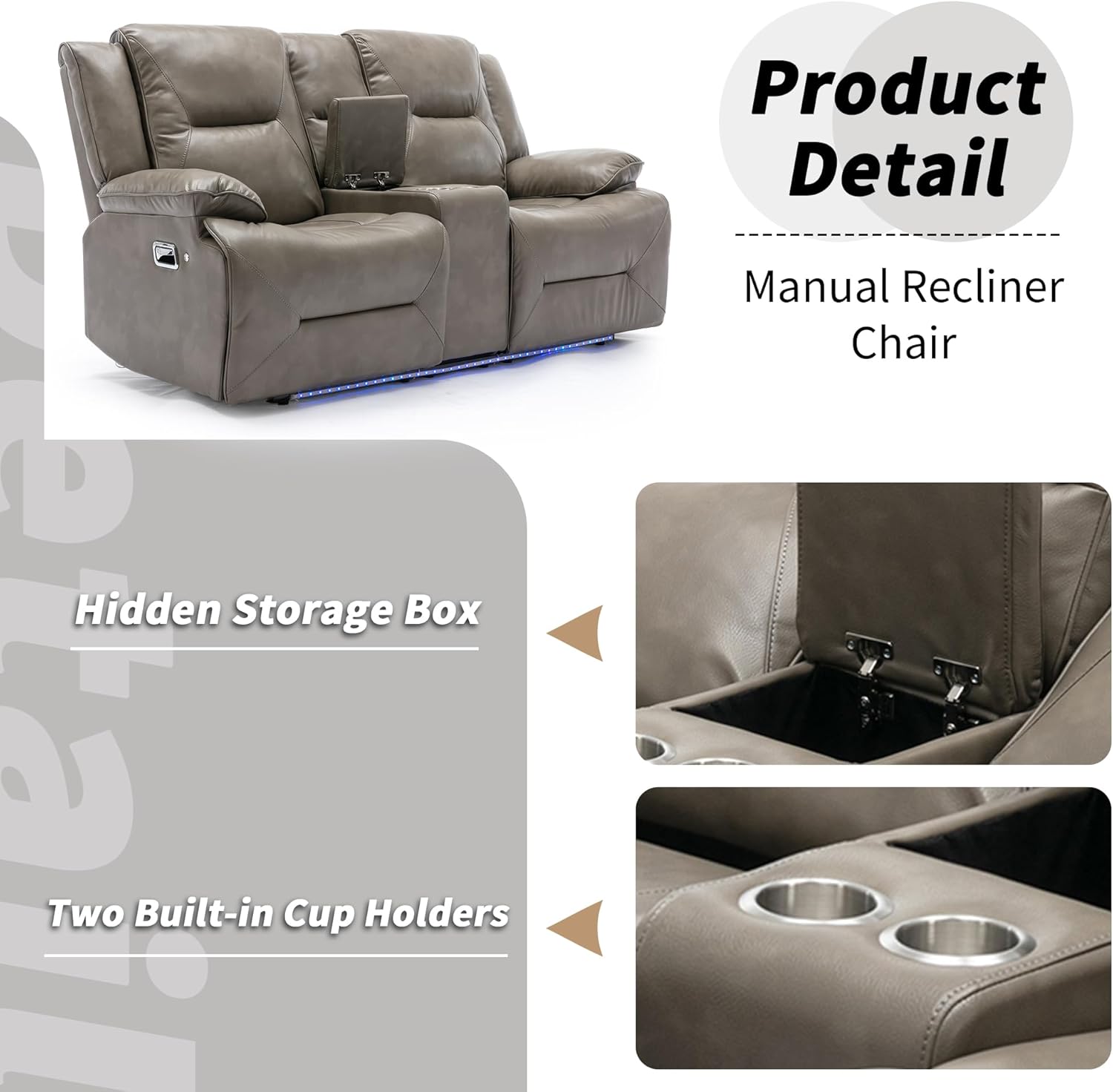 360° Swivel Chairs with LED Light, Cup Holders and Storage Box, 2 Seater Manual Home Theater Seating Faux Leather Glider Rocking Reclining for Living Room, Bedroom, Grey
