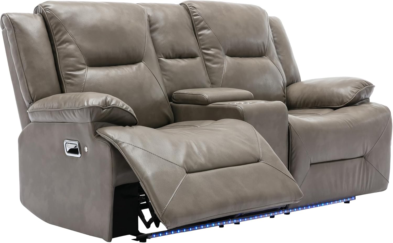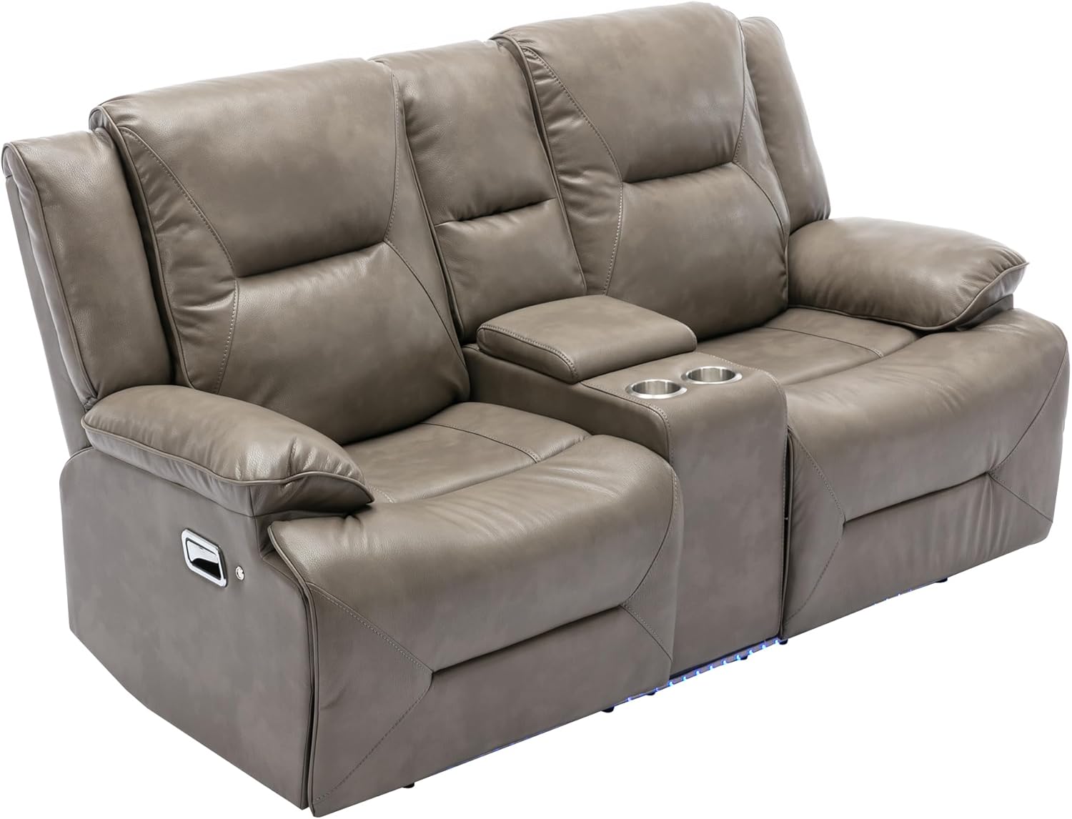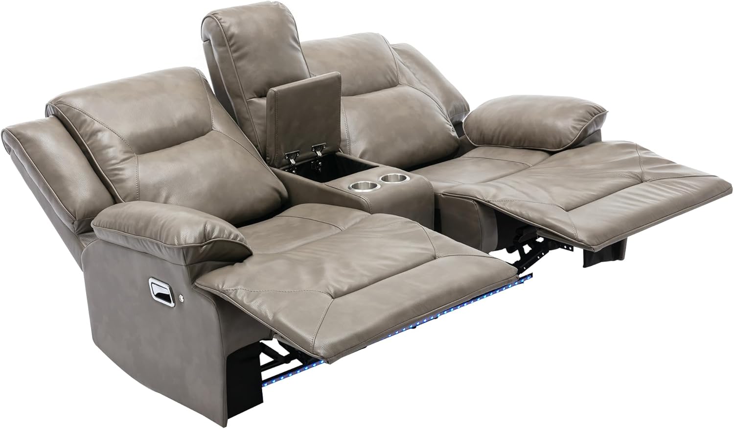 360° Swivel Chairs with LED Light, Cup Holders and Storage Box, 2 Seater Manual Home Theater Seating Faux Leather Glider Rocking Reclining for Living Room, Bedroom, Grey