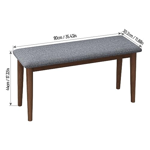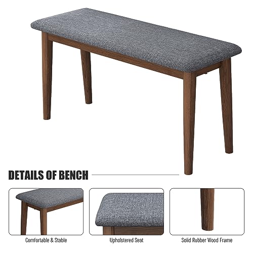 Walnut Color 3 Pieces Dining Table Set with 1 Rubberwood Rectangular Table and 2 Benches with Grey Fabric Cushions, 44.88 x 26.77 x 29.45 Inches, Space Saving Design