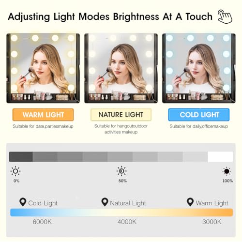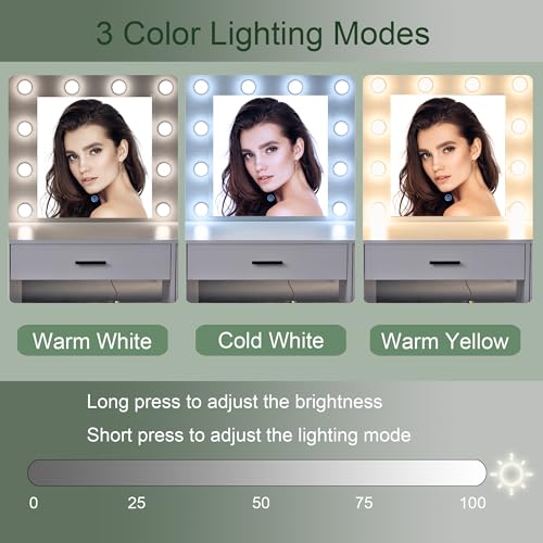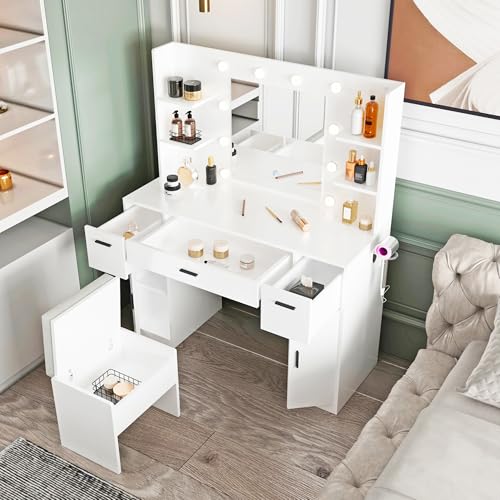 Vanity Desk, Make up Vanity Desk with Mirror and Lights, Vanity with Power Outlet and Stool, 3 Drawer 3 cabinets Storage Unit Dresser, Vanity with Lights 3 Models Settings for Bedroom (White)