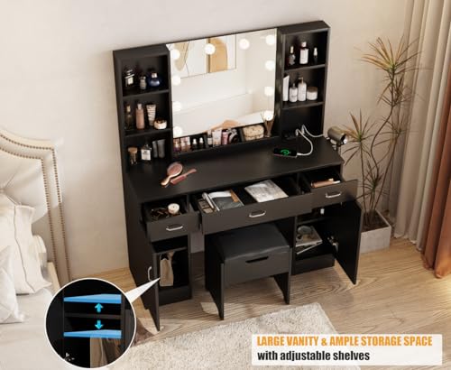 Vabches Vanity Mirror with Lights, Big Makeup Vanity Table Set with Comfortable Bench and Side Cabinets, Lots Storage, 45.2inch, White (Casual)