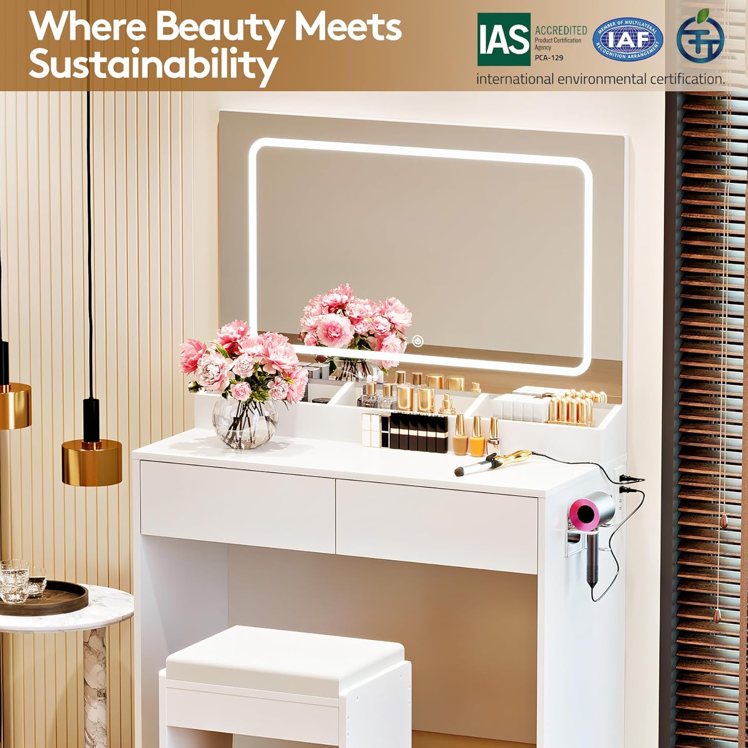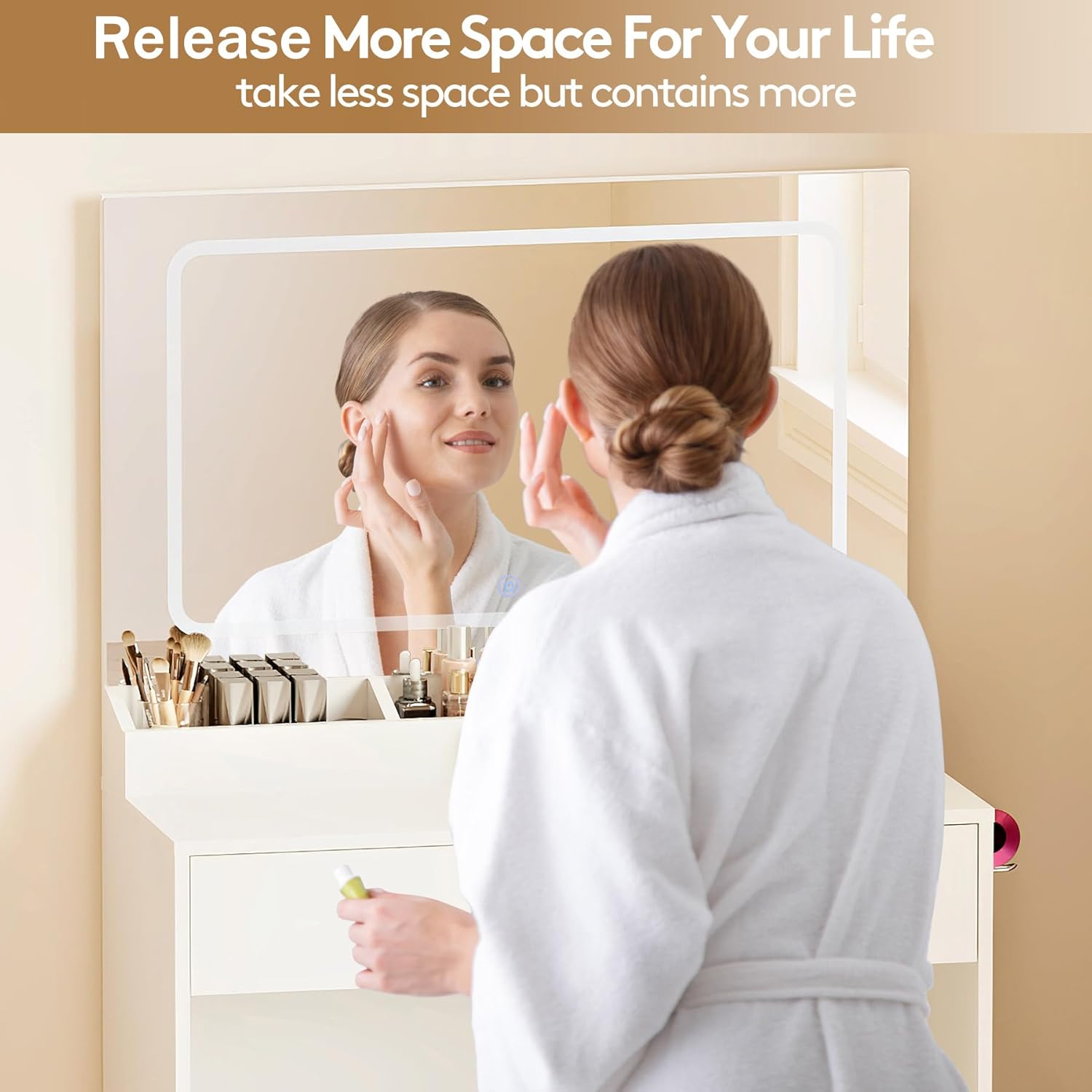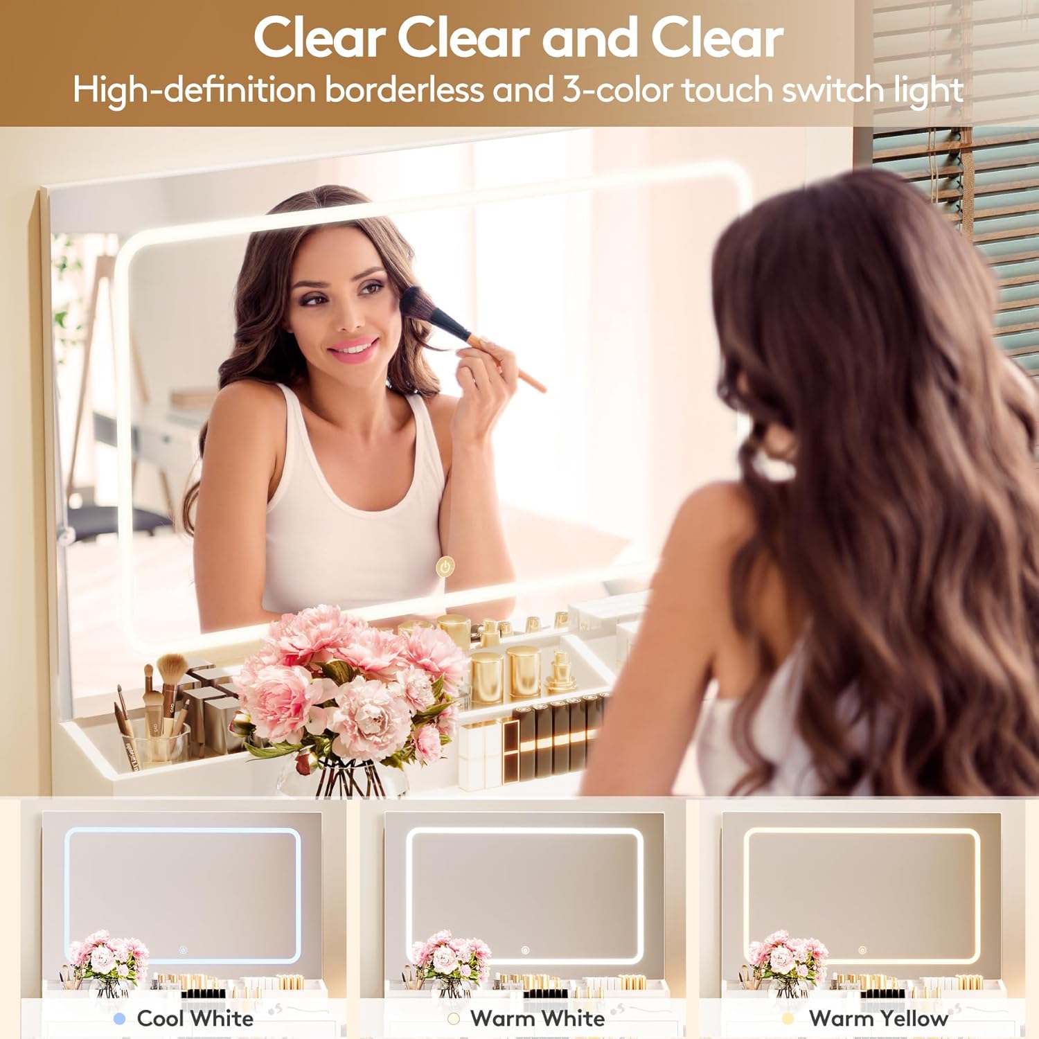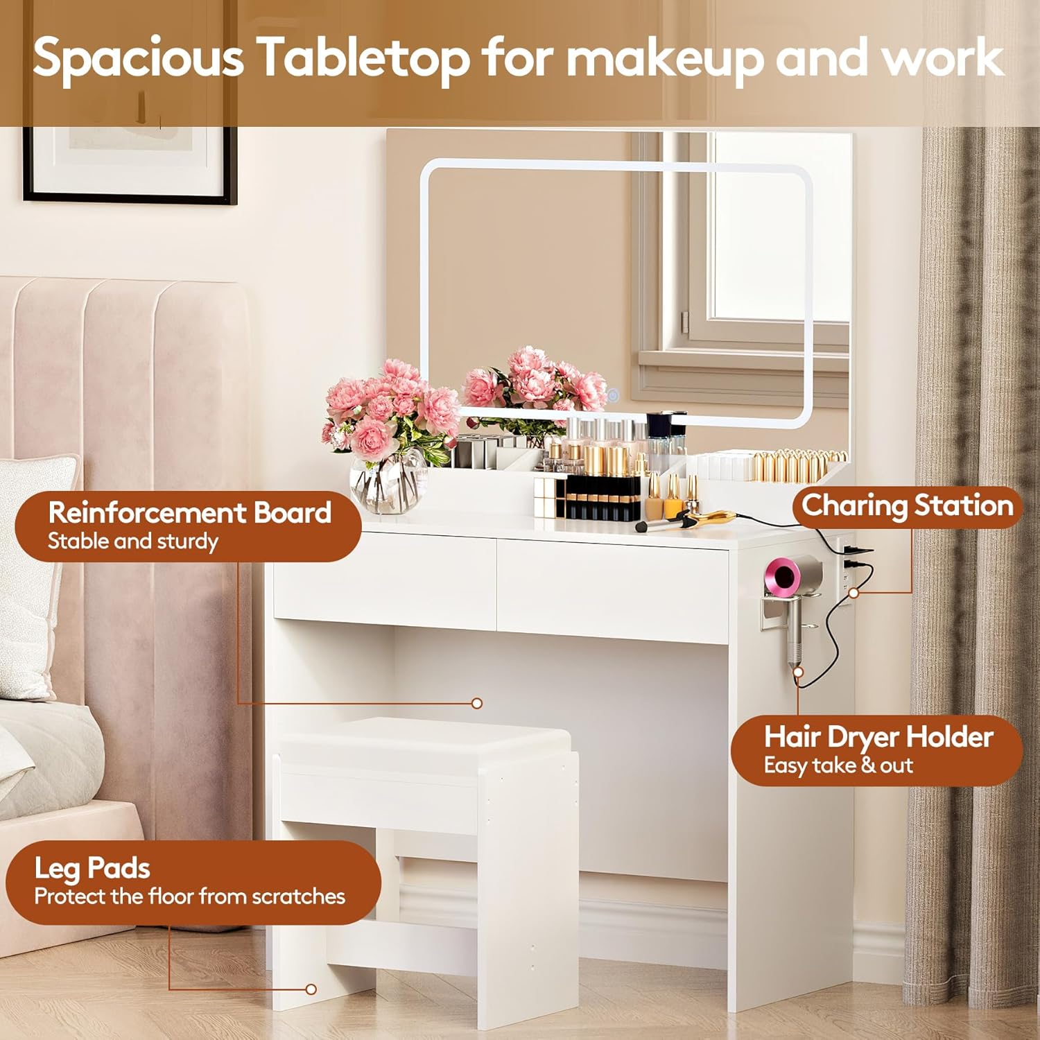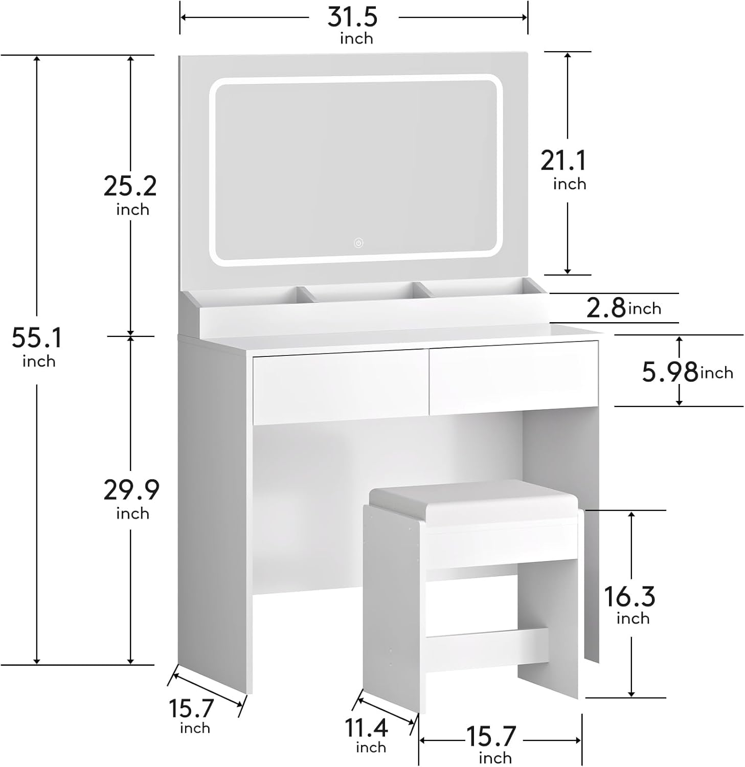 Vanity Desk with Large Lighted Mirror & Power Outlet, 3 Color Lighting Modes, Makeup Vanity Table with 2 Drawers, Vanity Set for Girls Women with Storage Stool, White Vanity Table for Bedroom