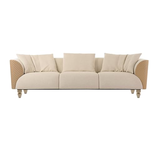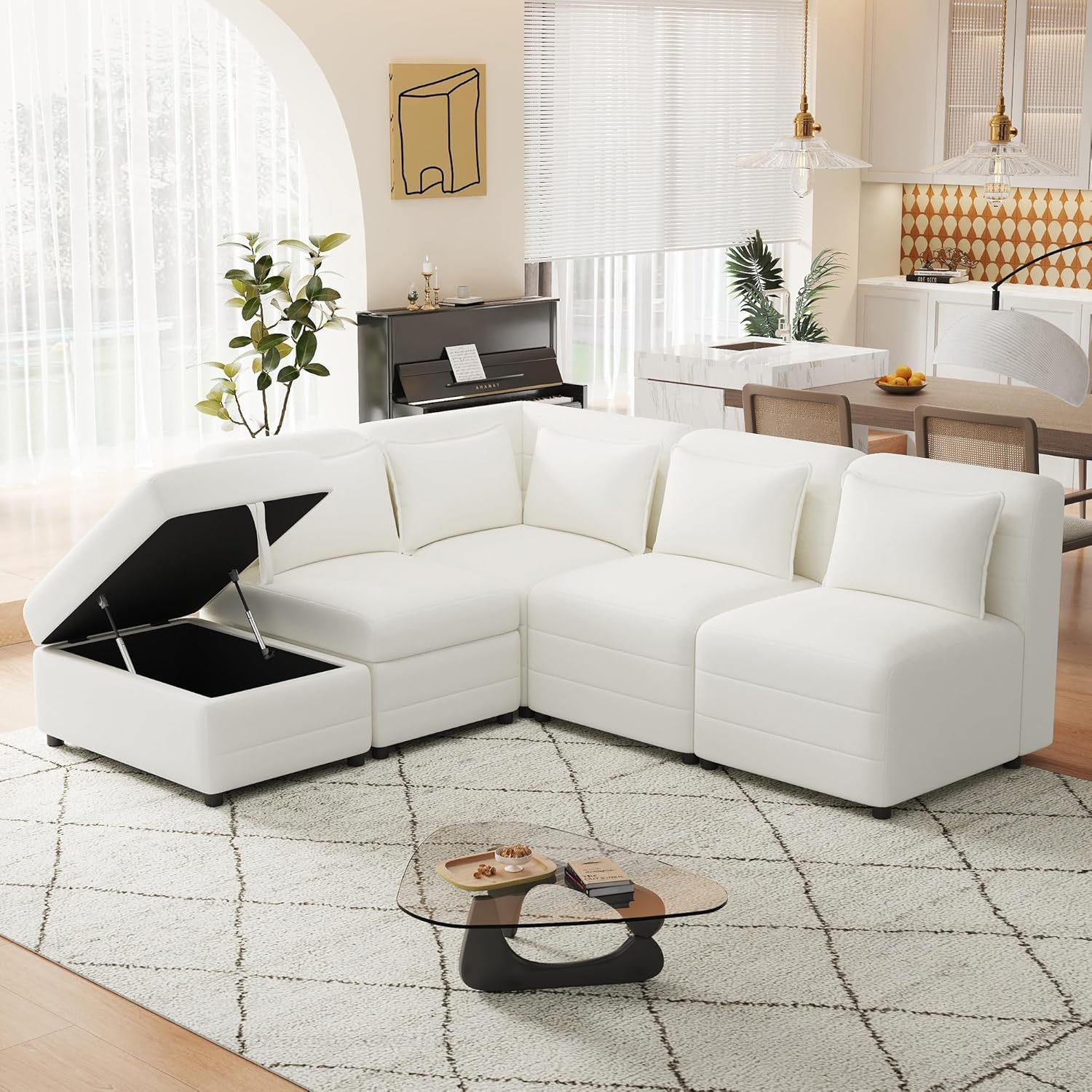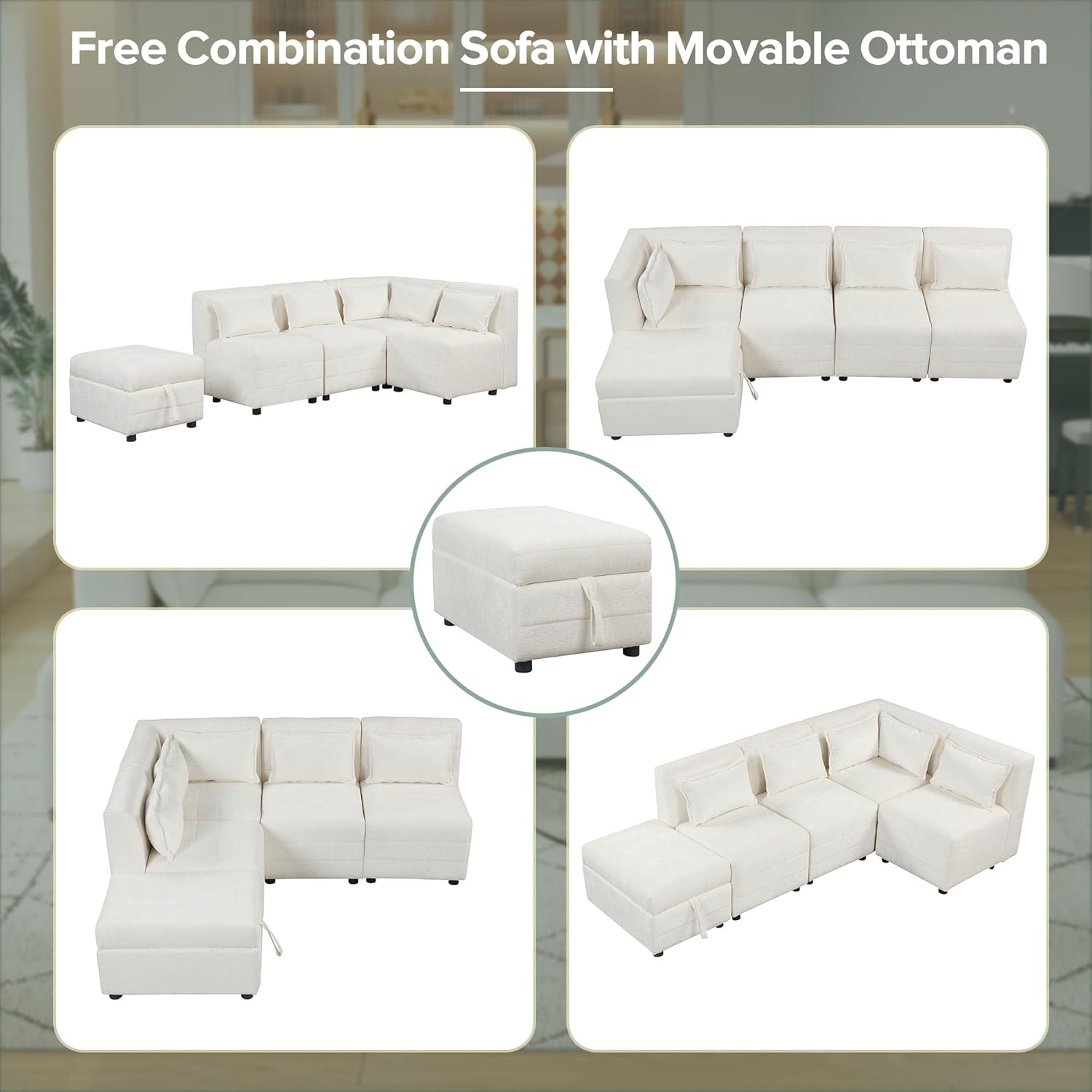 77'' Sectional Couch, Modular Couches for Living Room, Upholstered 5-Seater L-Shaped Couch with Storage Ottoman & 5 Pillows, Chenille Convertible Sectional Sofa, Free-Combined, Cream