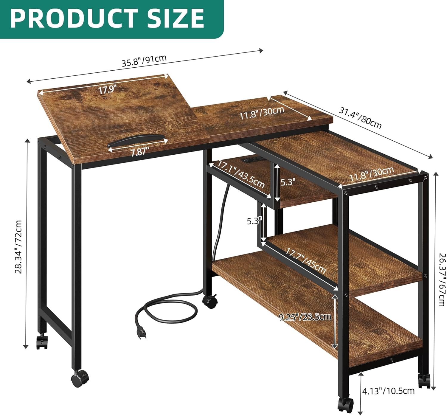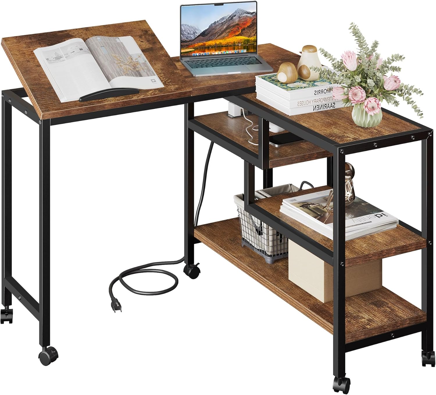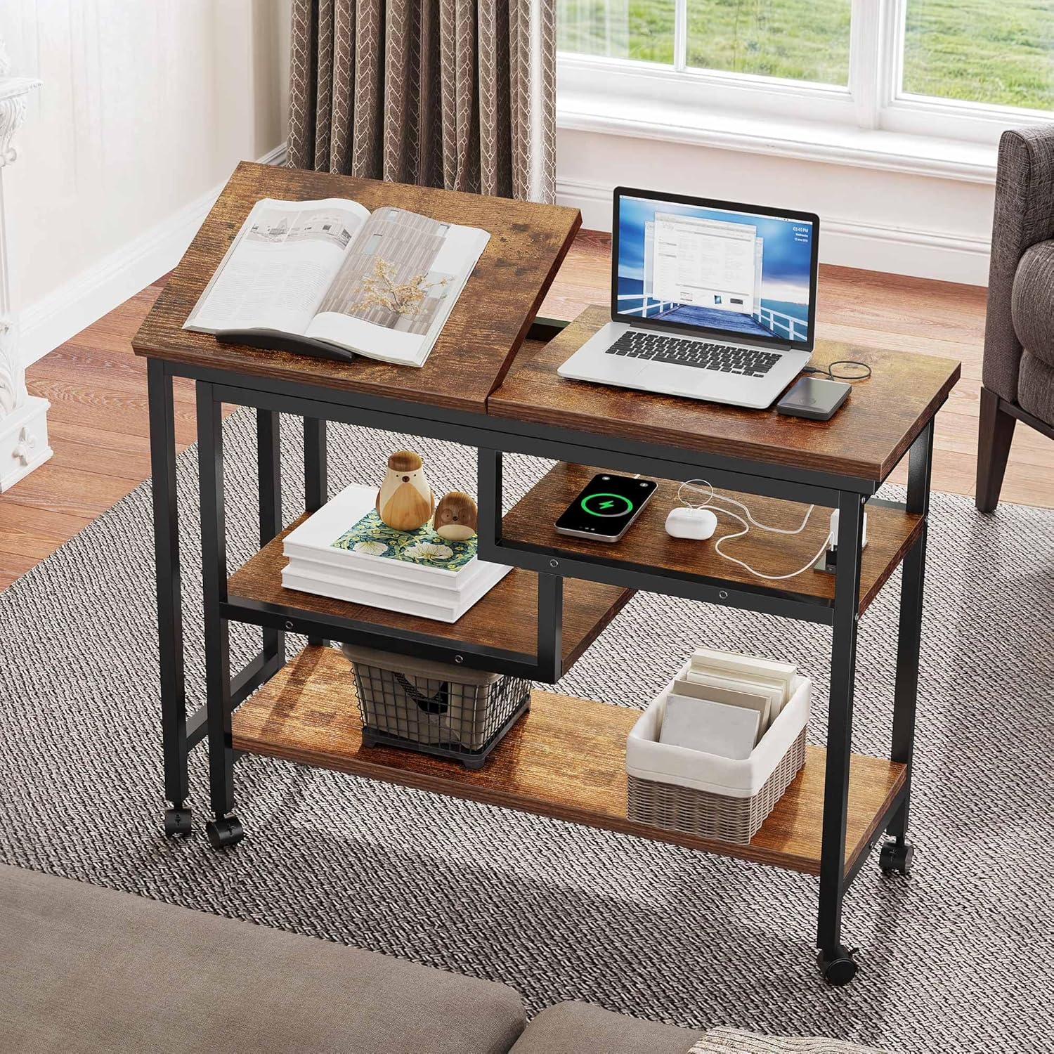 YITAHOME 360° Rotating Sofa Side Table with Tiltable Tabletop, Mobile Side Couch Table with 3-Tier Storage Shelves, Movable Laptop Table Swivel Rolling Desk with Sturdy Metal Frame