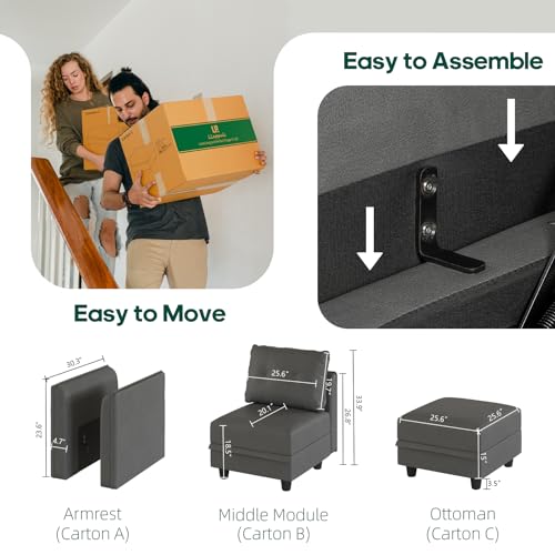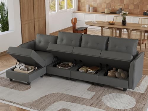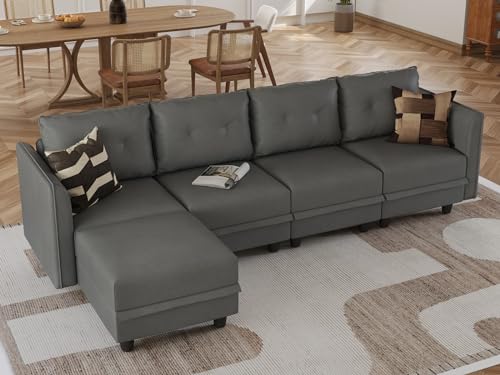 LLappuil Modular Sectional Sofa Faux Leather Fabric Reversible 4 Seater L Shape Sectional Couch with Storage, Modern Modular Sofa Chaise with Ottoman for Apartment, Cognac Brown