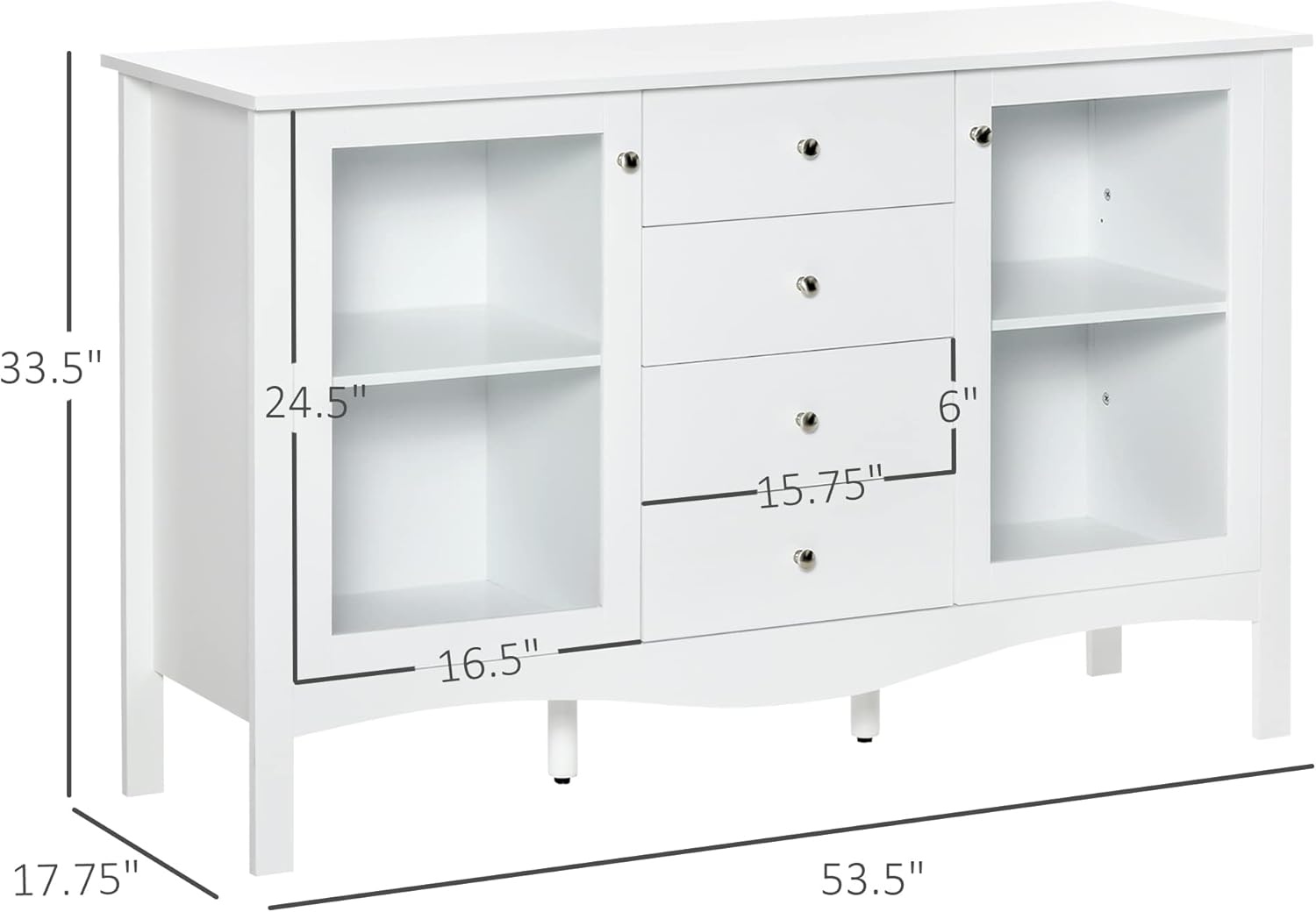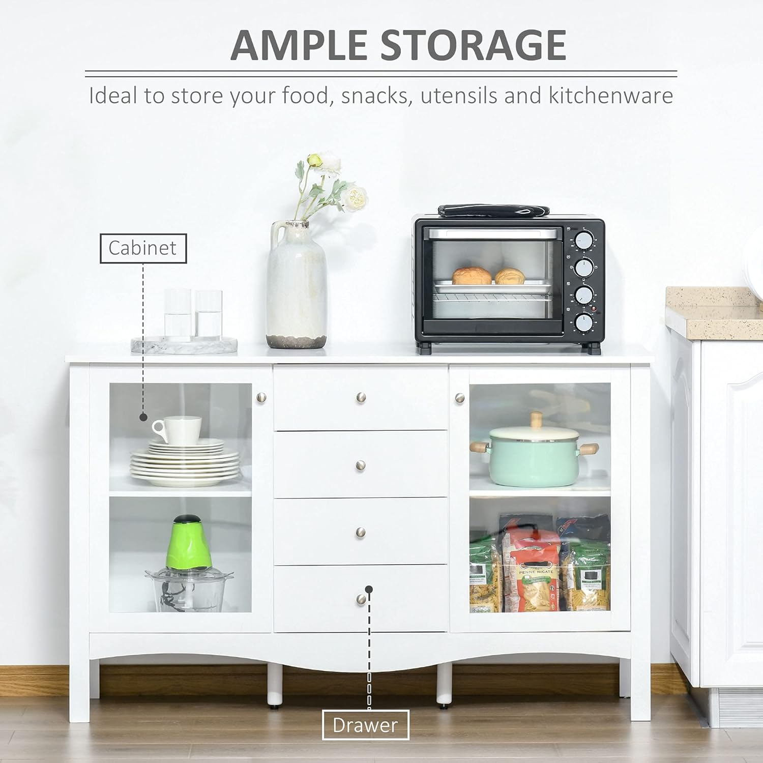 HOMCOM Sideboard Buffet Cabinet, Kitchen Cabinet, Coffee Bar Cabinet with Glass Doors, Drawers and Adjustable Shelves, White