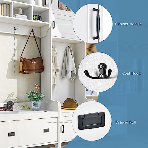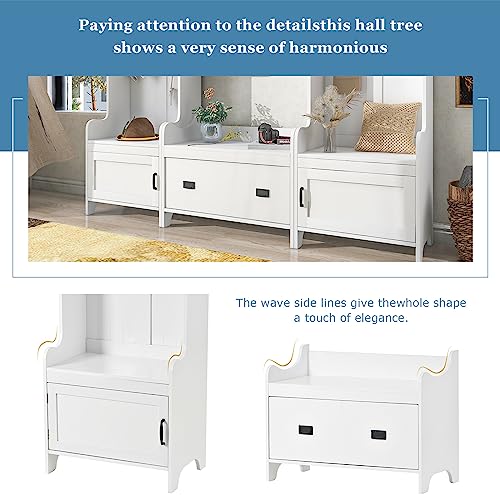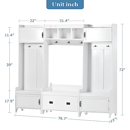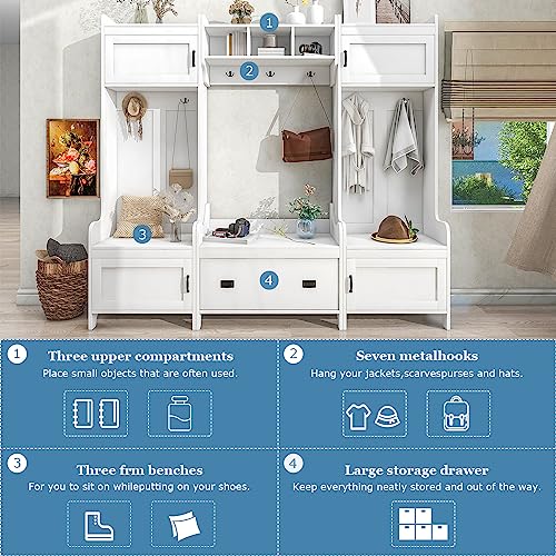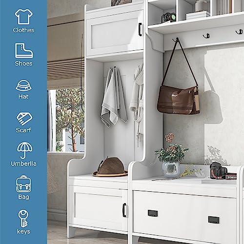 BNSPLY Hall Tree with Bench and 24 Shoe Cubbies, 3 in 1 Entryway Bench with Coat Rack and Shelves, Mudroom Bench with 6 Double Hooks, Entryway Furniture for Hallway (White, 60" L x 31.5" W x 77" H)