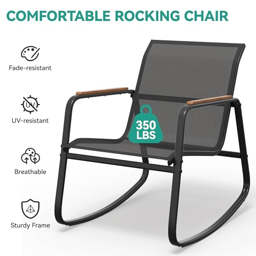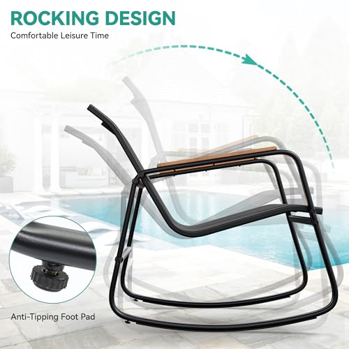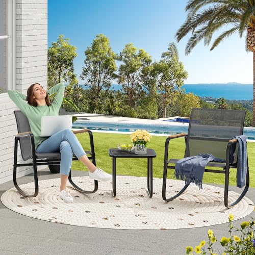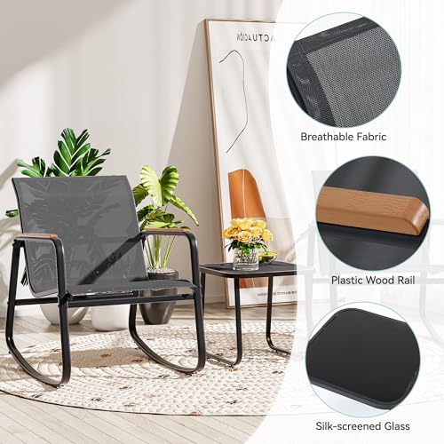 YITAHOME 3 Piece Rocking Bistro Set, Outdoor Patio Furniture Set with Wooden Armrests, Porch Chairs Set with Glass Table for Lawn, Garden, Balcony, Poolside, Dark Gray