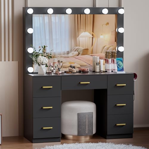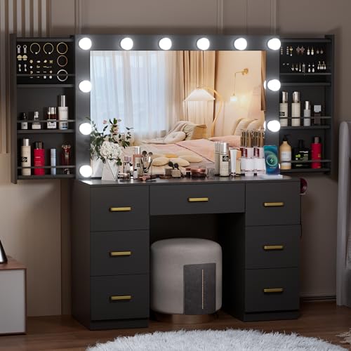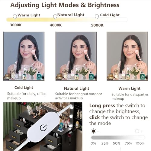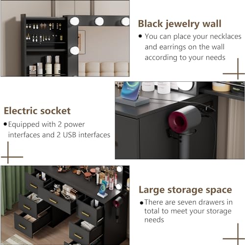 Black Makeup Vanity Desk with Lighted Mirror & Power Outlet,3 Color Modes, Brightness Adjustable,Vanity Table with Drawer,Sliding 2 Storage Wall-Mounted Jewelry,4 Shelves for Bedroom
