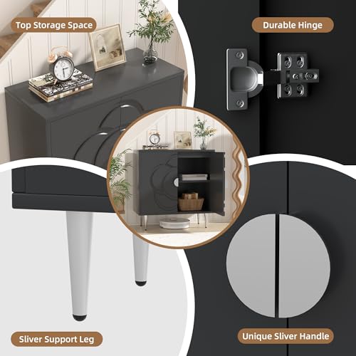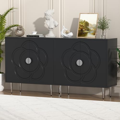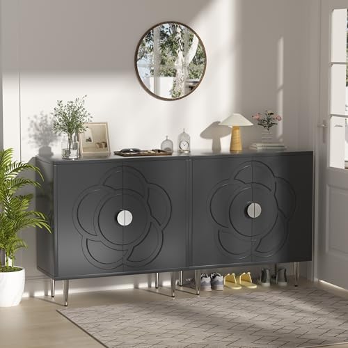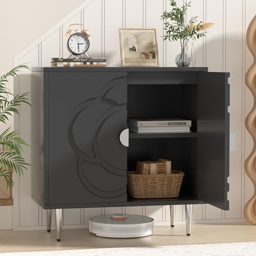 Storage Cabinet with Doors, Accent Cabinet with Decorative Flower Pattern Panel, Modern Sideboard Buffet Cabinet for Living Room, Bedroom, Entryway, White