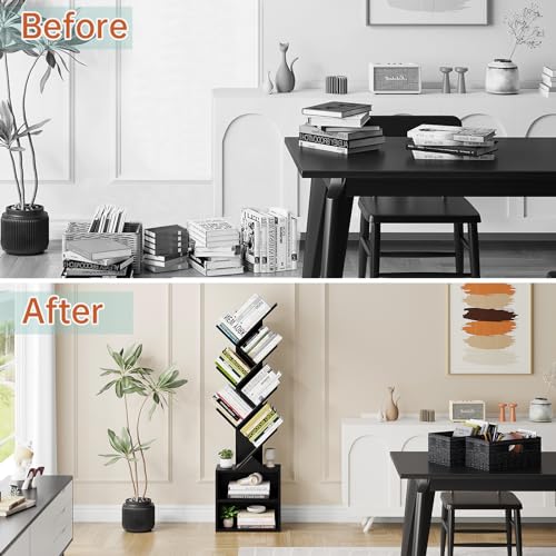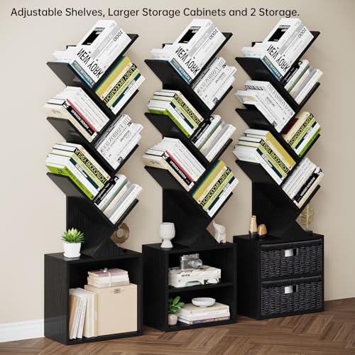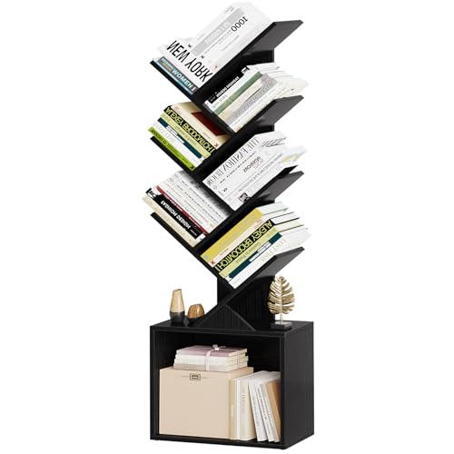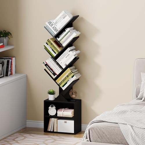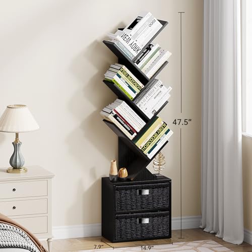 Vagusicc 6 Tier Tree Bookshelf, Modern Floor Standing Bookcase with Storage Drawer, Space Saving Storage Organizer Book Shelves for Books, Tall Wood Storage Rack for Bedroom/Living Room/Home Office