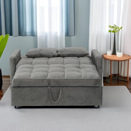 Pull-Out Convertible Sofa Bed with Storage, Plush Velvet Two Seater Recliner Loveseat Coach Bed, Multi-Functional Livingroom Sleeper Sofa Bed, Small Space Sofa with USB Charger - Grey