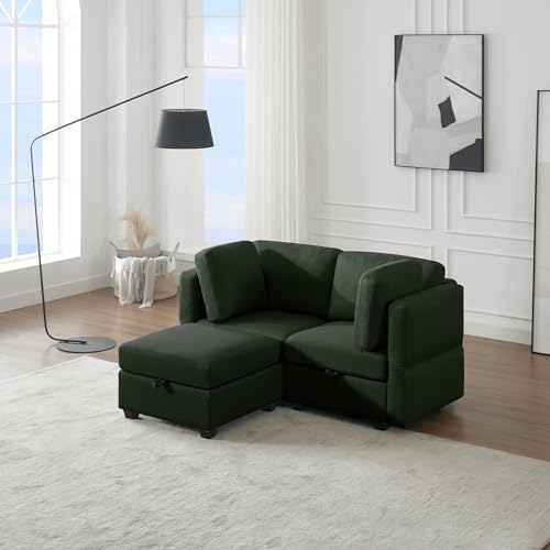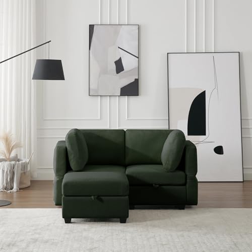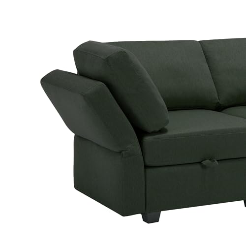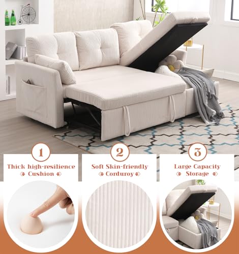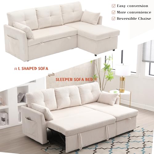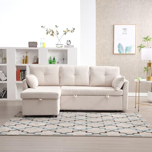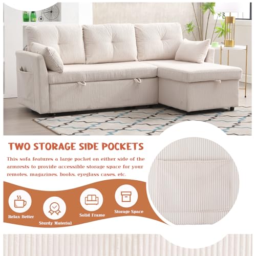 Corduroy Couch with Pull Out Sofa Bed, Sleeper Sofa with Storage Chaise Lounge, Sectional Couch with Comfy Pillows and Pockets, Convertible L Shape Couches for Living Room, Bedroom, Office, Beige