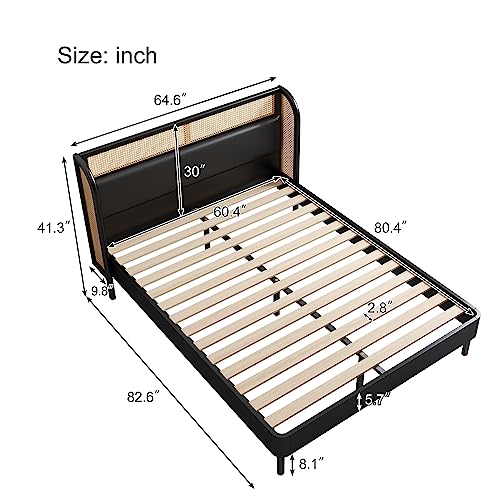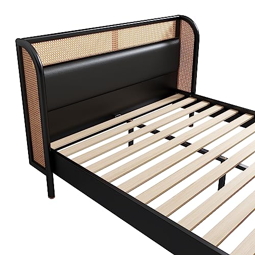 Merax Modern Rustic Solid Wood Platform Bed with Rattan Headboard Full Bed Frame No Box Spring Needed/Easy Assemble,Black