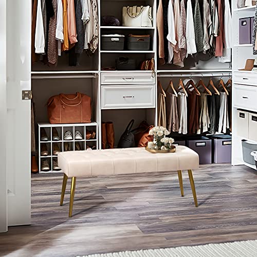LUE BONA Button-Tufted Ottoman Bench, 44.5'' Litchi Stria Faux Leather Upholstered Bedroom Bench, Padded Entryway Bench, End of Bed Bench with Metal Legs, for Decorative, Living Room, White