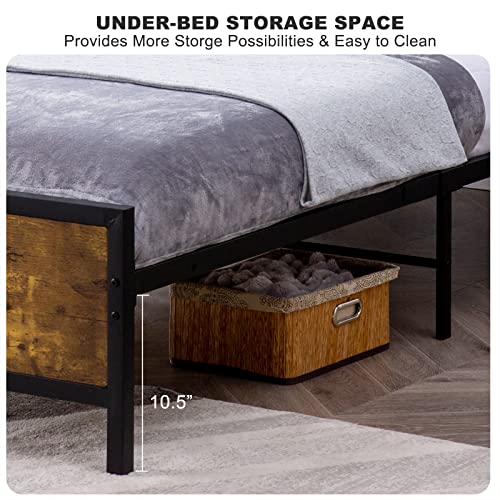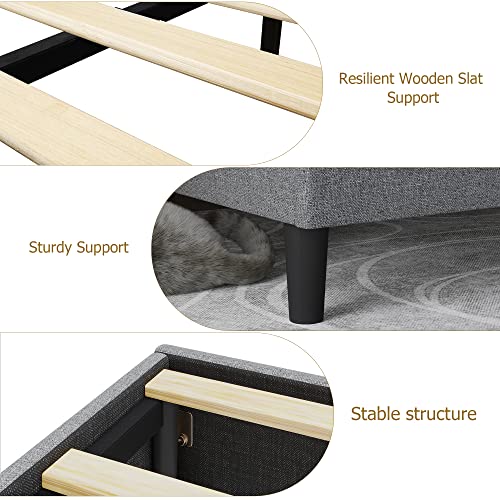 Bed Frame Queen Size Upholstered Platform Beds with Headboard Linen Fabric Wood Slat Support + Iron Frame, Mattress Foundation, No Box Spring Needed, Light Grey