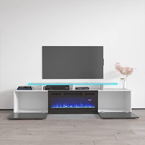 Rova BL-EF Fireplace TV Stand for TVs up to 85", Modern High Gloss 75" Entertainment Center, Electric Fireplace TV Media Console with Storage Cabinets and LED Lights
