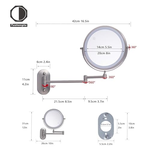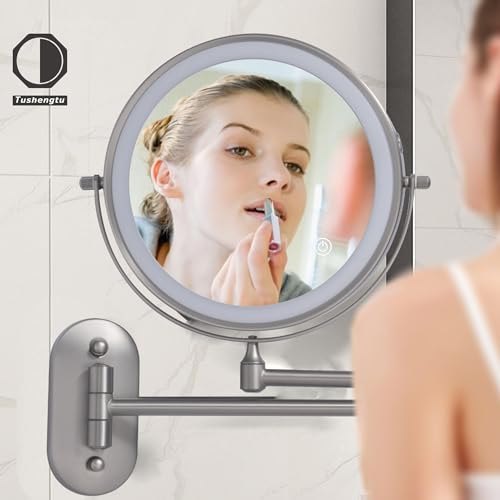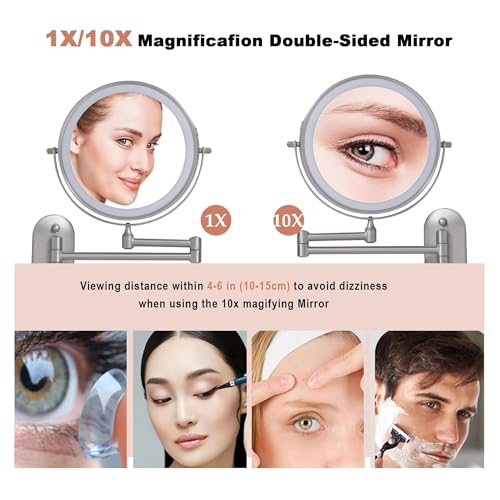 9 Inch Large Rechargeable Lighted Makeup Vanity Mirror Wall Mounted, 1X/10X Magnifying Mirror with Light for Bathroom 3000mAh USB Charging, Chrome Wall Mounted Mirror Swing Arm with 3 Light for Makeup