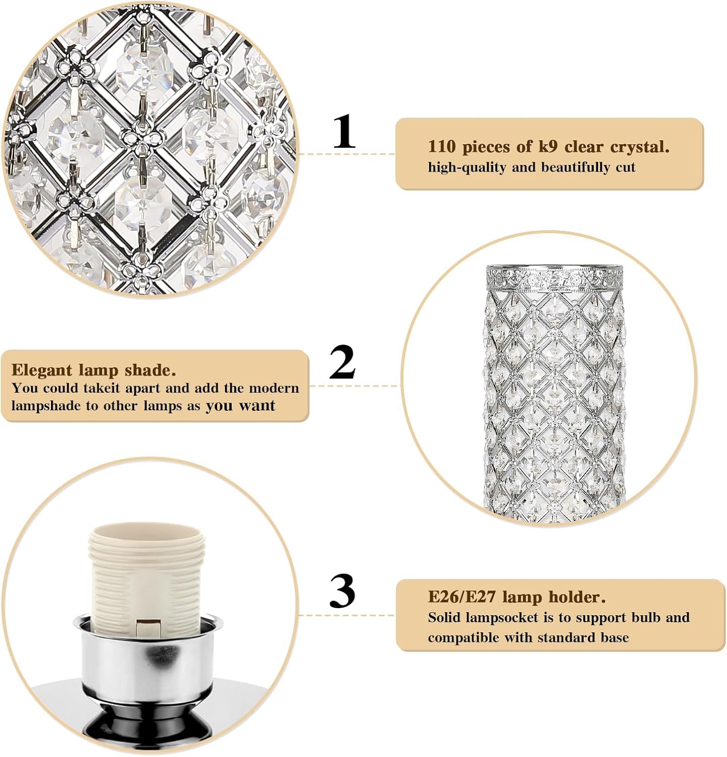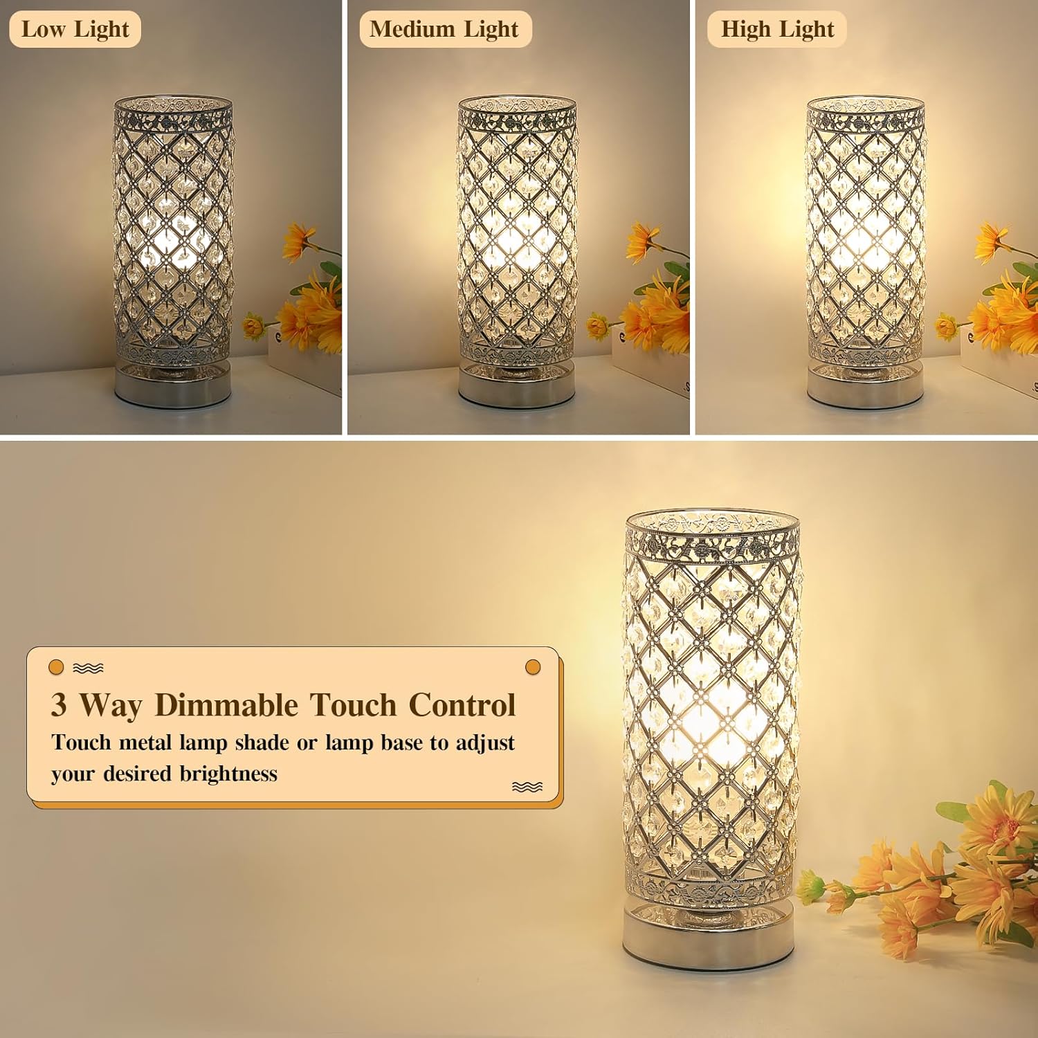 Seaside village Crystal Table Lamp Touch Control Dimmable Accent Desk Lamp Bedside Modern Table Light with Silver Lamp Shade Night Light Fixture for Living Room Bedroom Kitchen