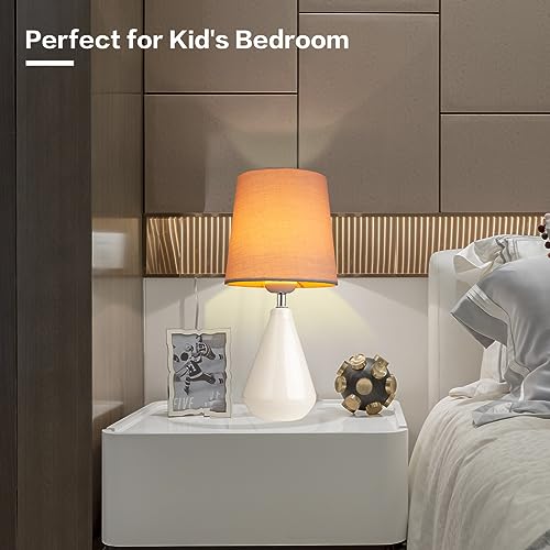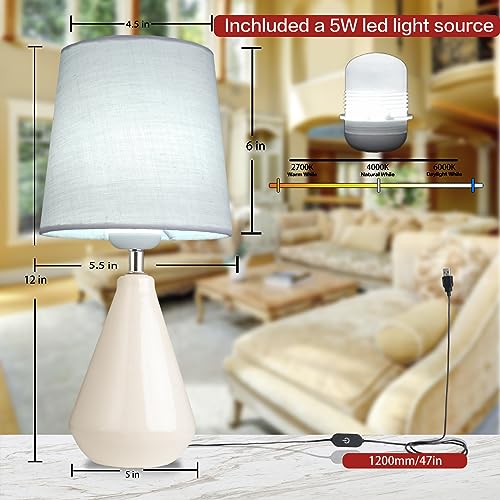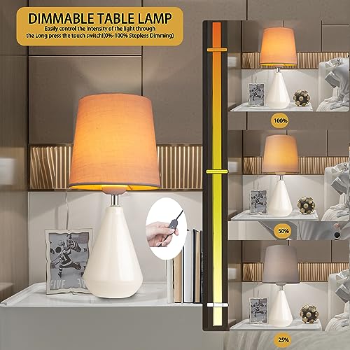 Small Bedside Table Lamp for Bedroom-Desk Lamp Set of 2, with 3 Way Dimmable Touch Control,12" Nightstand Ceramic Lamp with Fabric Shade for Kids Room,Living Room,Dorm,Home Office(White)