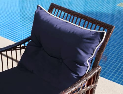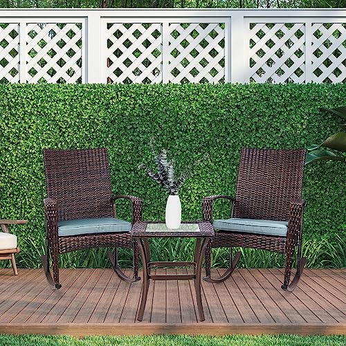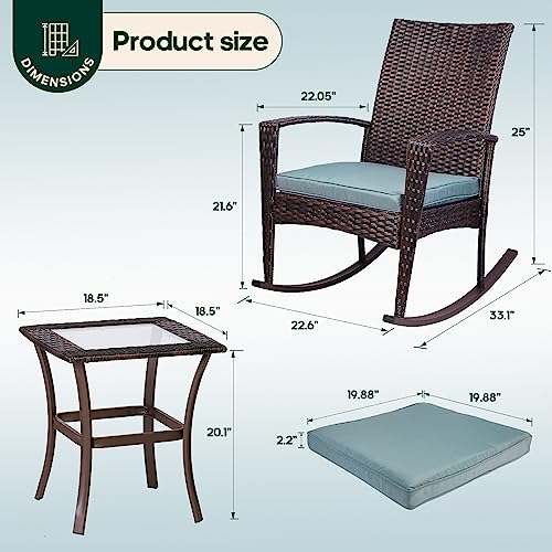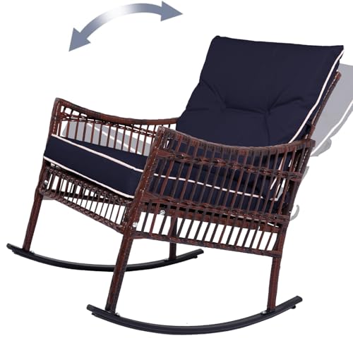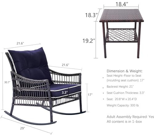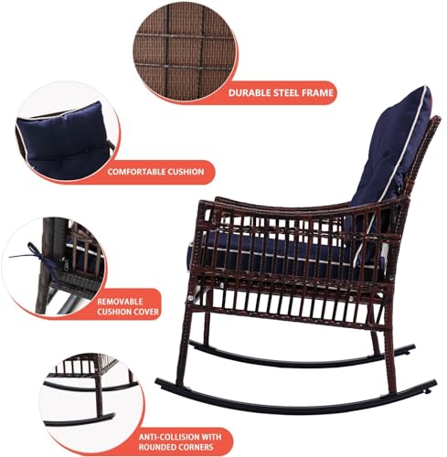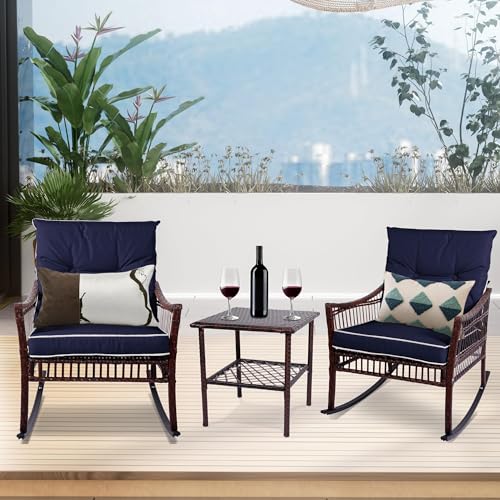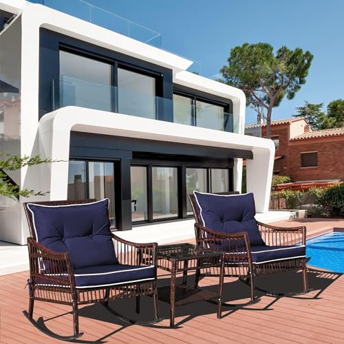 Niubya 3 Piece Wicker Rocking Chair Patio Furniture Sets, Outdoor Wicker Bistro Rattan Chair Conversation Sets with Cushions and Coffee Table, Navy and Brown