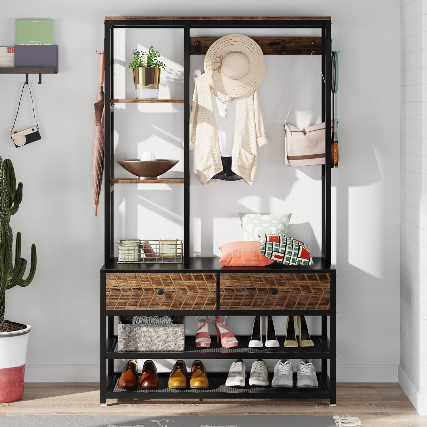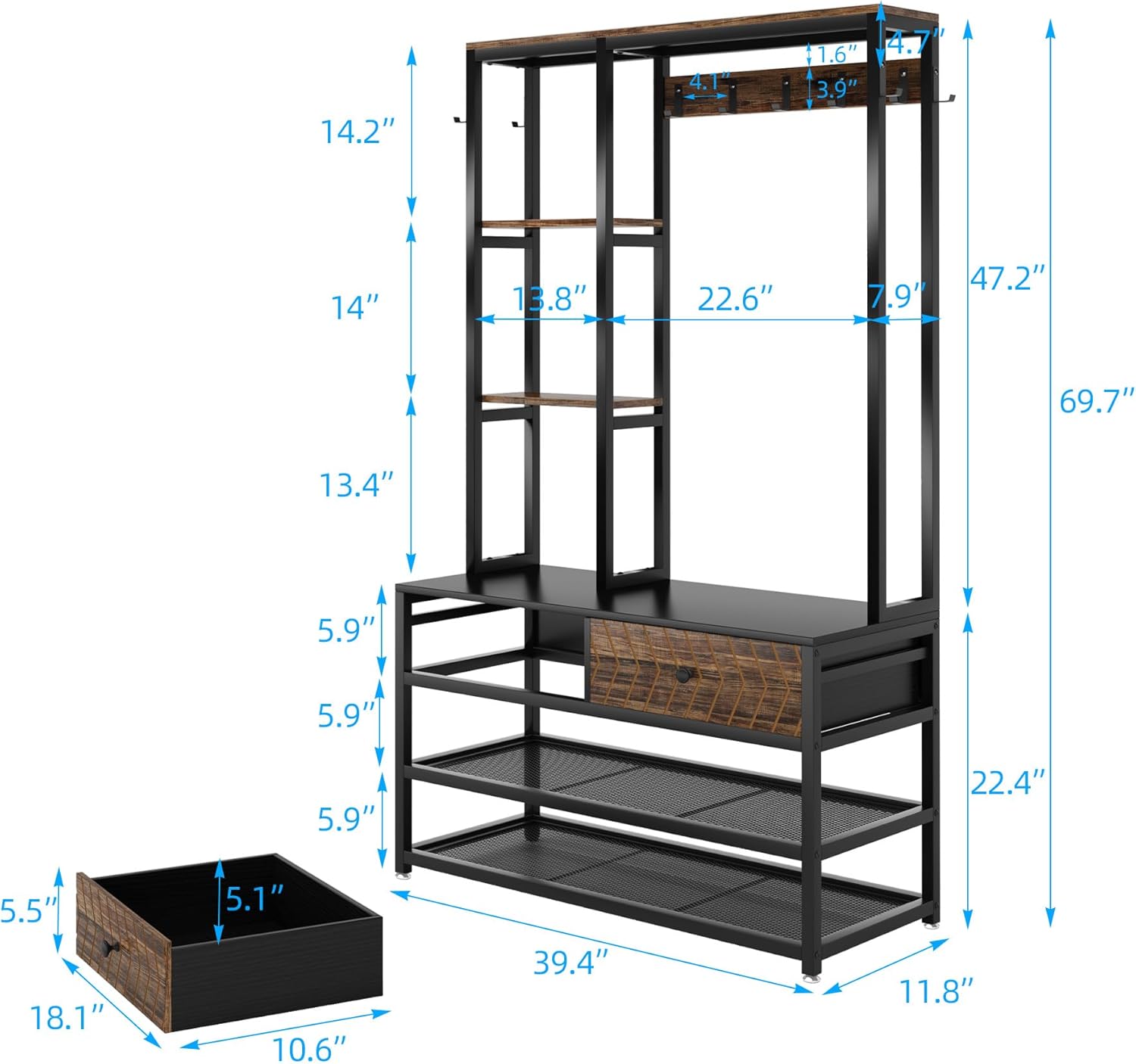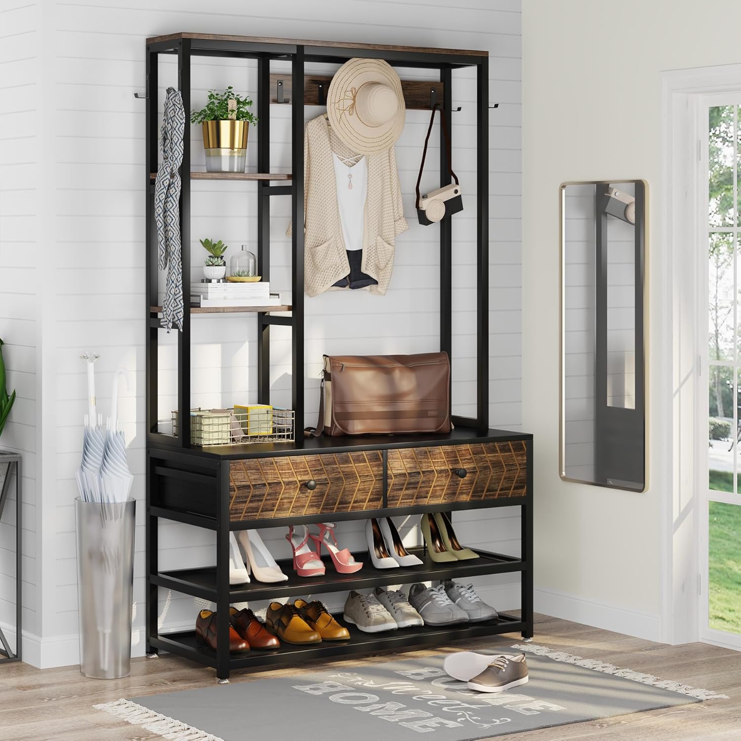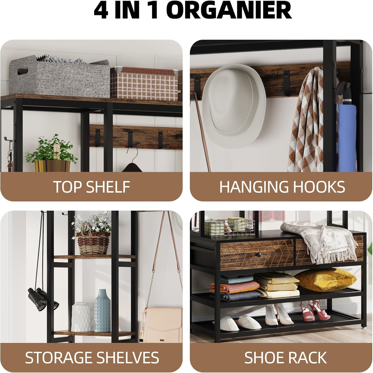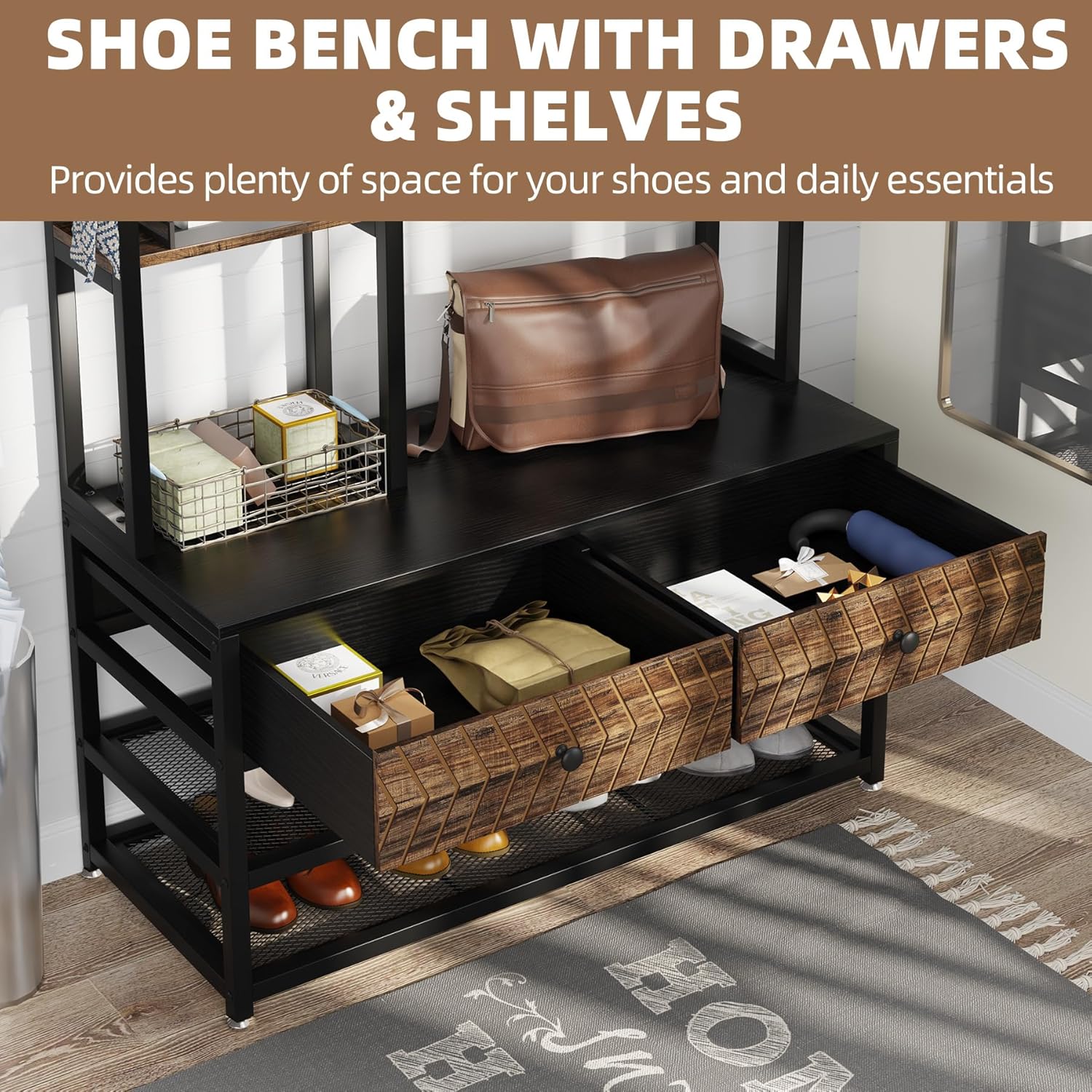TIYASE Entryway Bench with Coat Rack, 5-IN-1 Hall Tree with Drawers and Shoe Storage, Large Freestanding Coat Rack Shoe Bench with Storage Shelves, 9 Hooks for Hallway Bedroom Mudroom, Brown