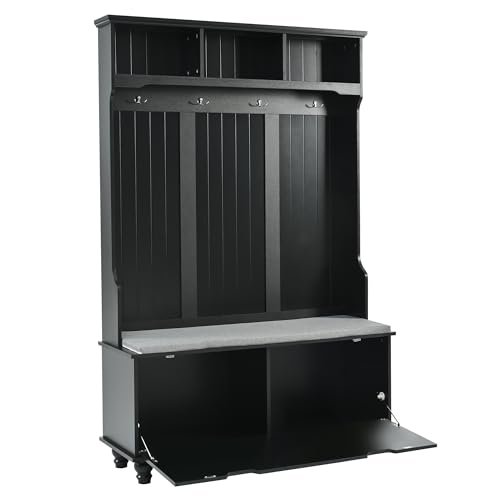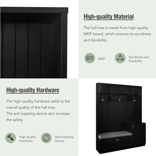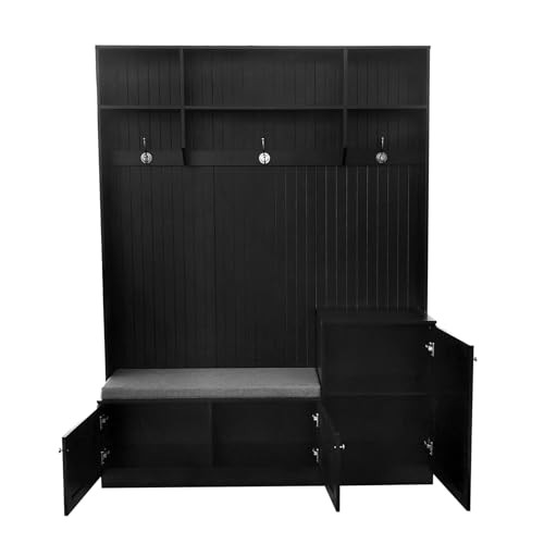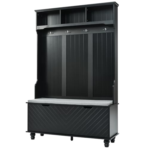Modern 47.2'' Wide Hall Tree with Cushion and 4 Sturdy Hooks, 4-in-1 Entryway Bench with Coat Rack, Storage Bench, 3-Open Cubbies, Two Lower Cabinets (Black,65)