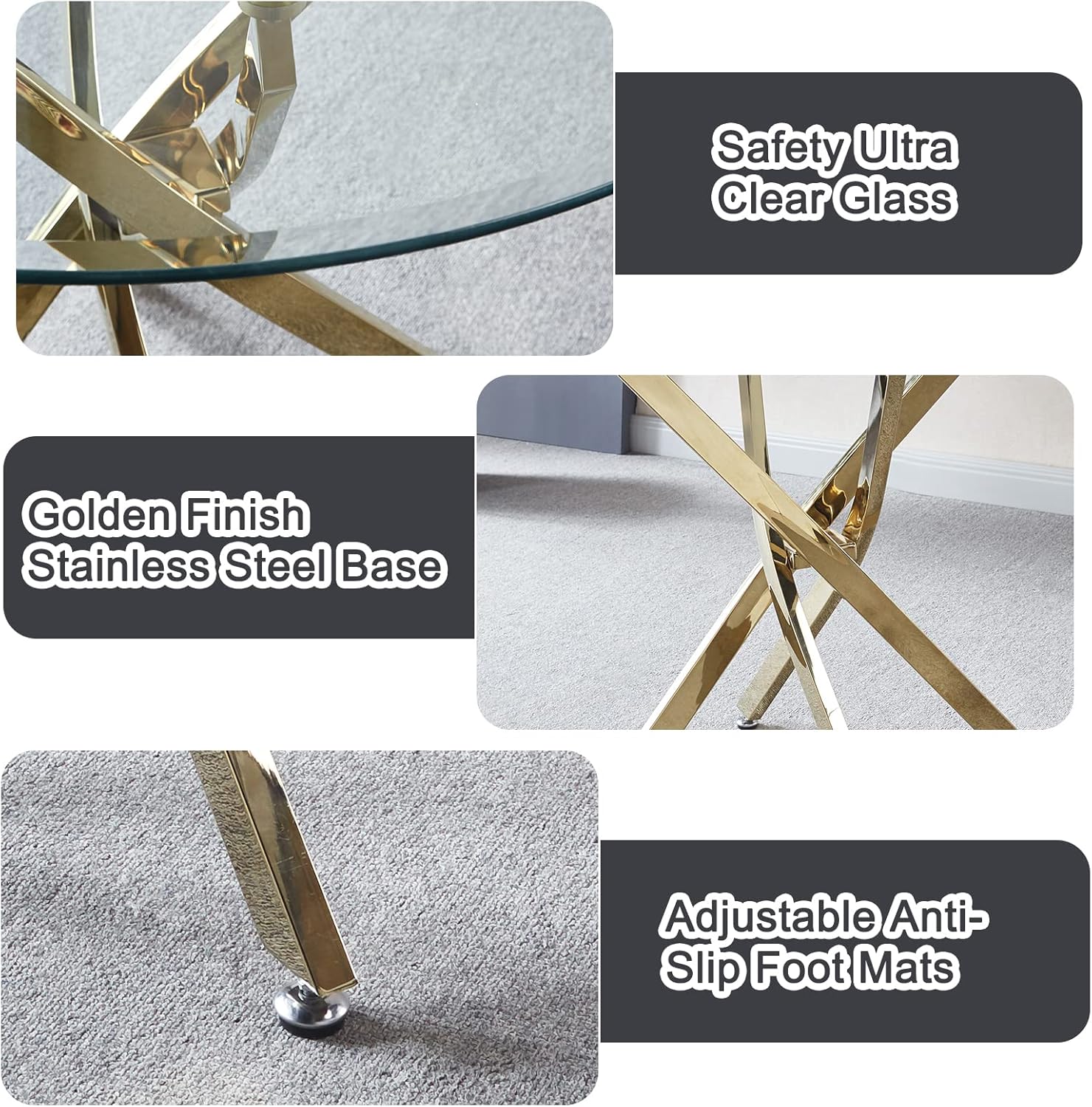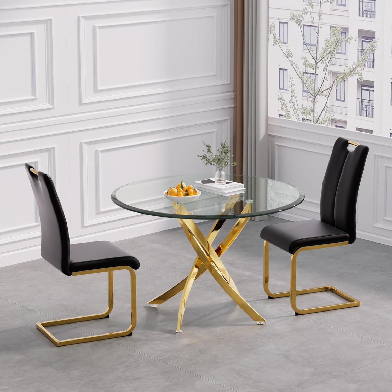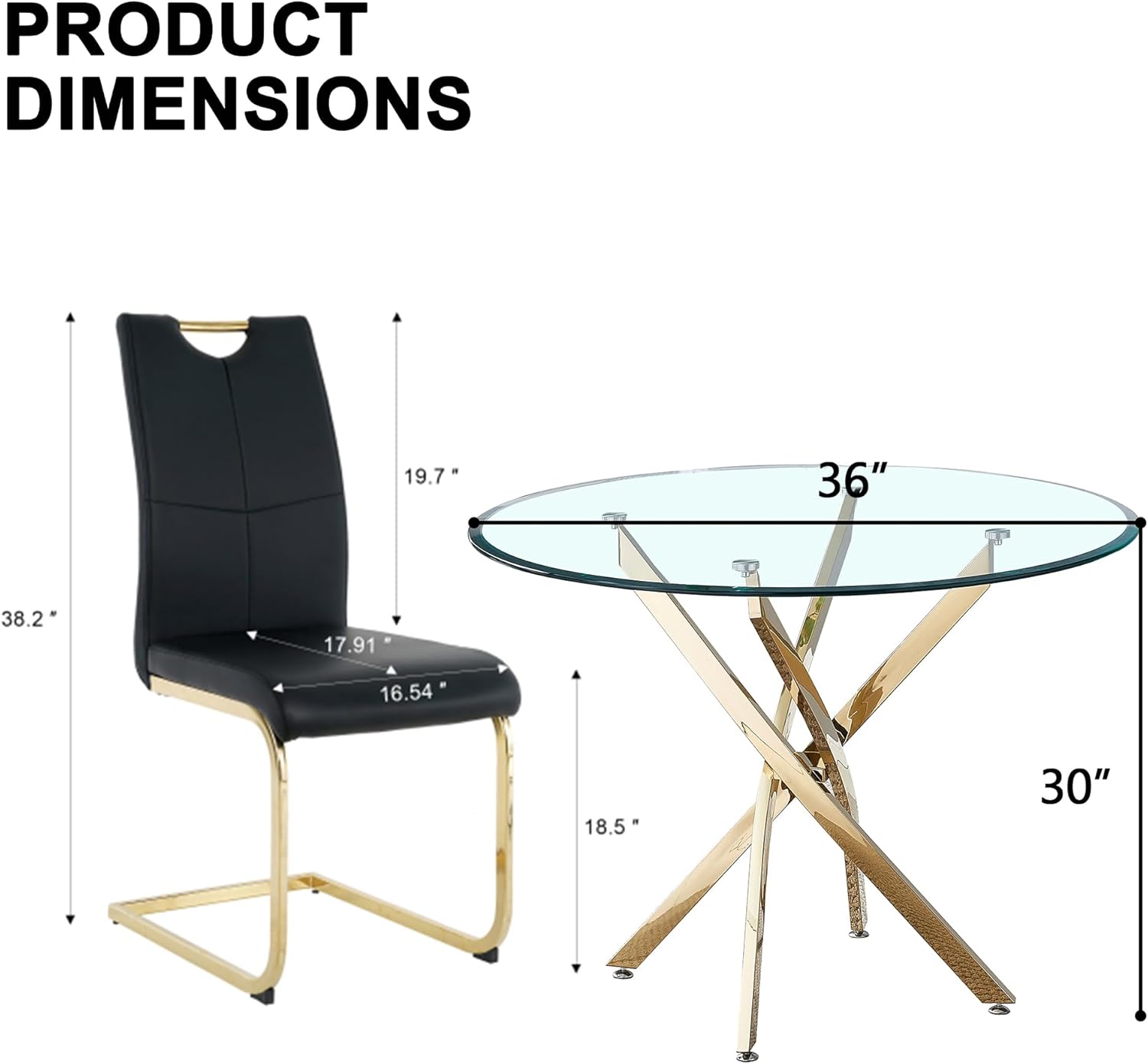 Round Dining Table Set for 2, 3-Piece Modern Glass Dining Room Set w/36in Round Dining Table & 2 PU Leather Chairs, Space-Saving Kitchen & Dining Room Set for Home, Living Room,Small Space, Gold Leg