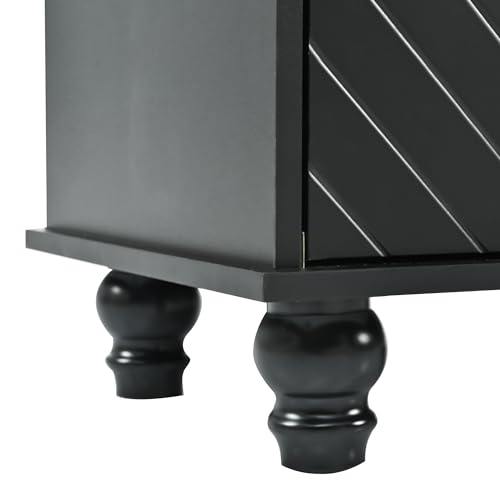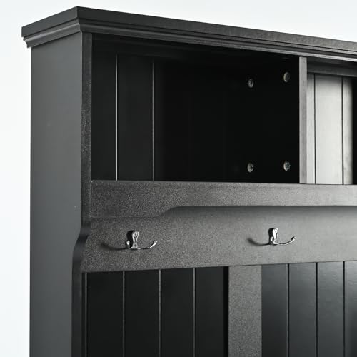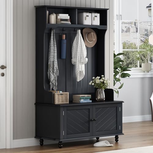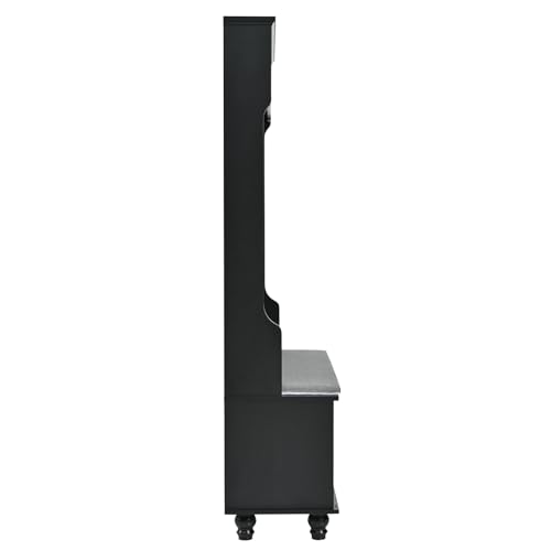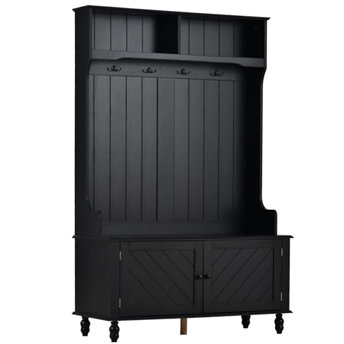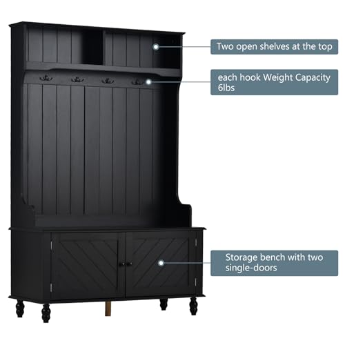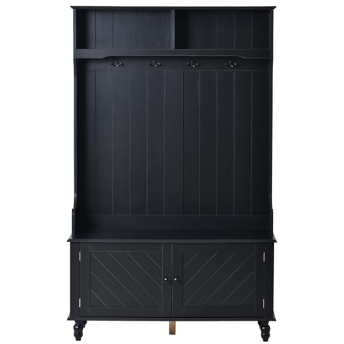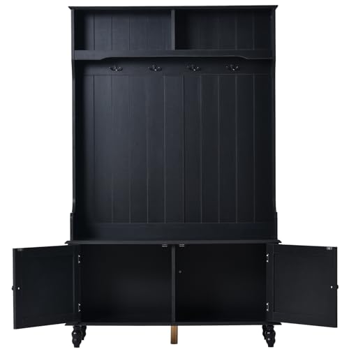 Entryway Hall Tree with Bench and Shoe Storage, 4-in-1 Bench with Coat Rack, Modern Wood Tree with 2 Storage Cabinets, 3 Top Shelves and 4 Hooks for Hallway, Living Room, Mudroom (Black)