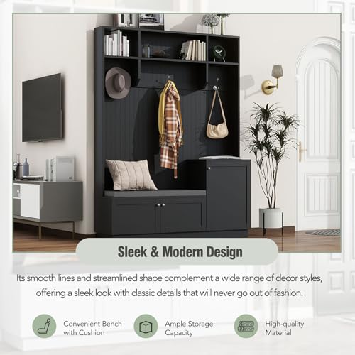 59" W Entryway Hall Tree Coat Rack with Bench and Shoe Storage, Mudroom Bench with Storage and 3 Hooks, Modern Entryway Coat Rack with Cushion and Top 3 Open Cubbies for Hallway (Black)