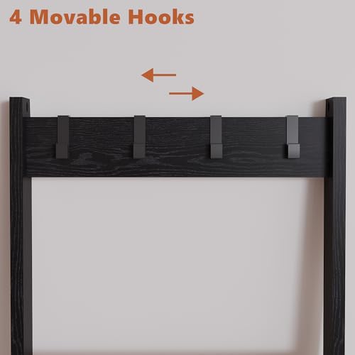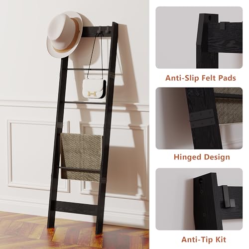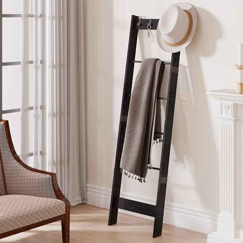 6 Tier Blanket Ladder Shelf for Living Room and Bedroom, Ladder Holder with 4 Metal Hooks, 5.2ft Blanket Quilt Holder Rack, Farmhouse Ladder Rack for Storage and Home Decor, Rustic Brown