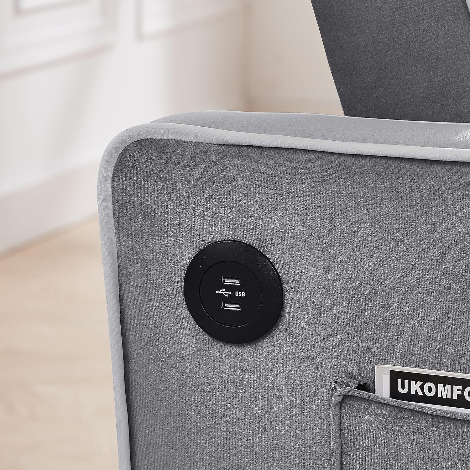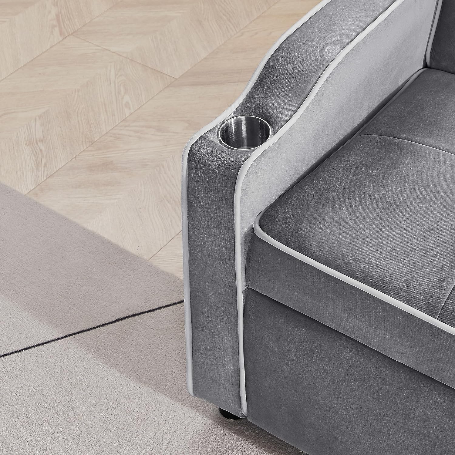 Chaise Lounge 3 in 1 Convertible Sofa Bed with USB Ports, Cup Holder, Side Pocket & Adjustable Backrest Chair, Space-Saving Couch Velvet Loveseat for Living Room, Apartment, Gray