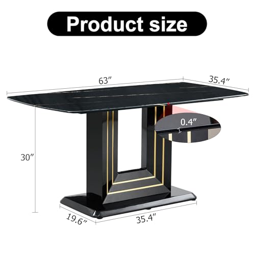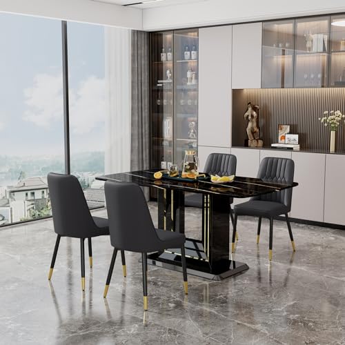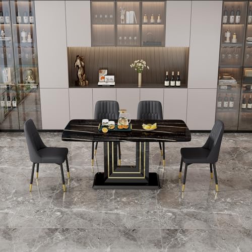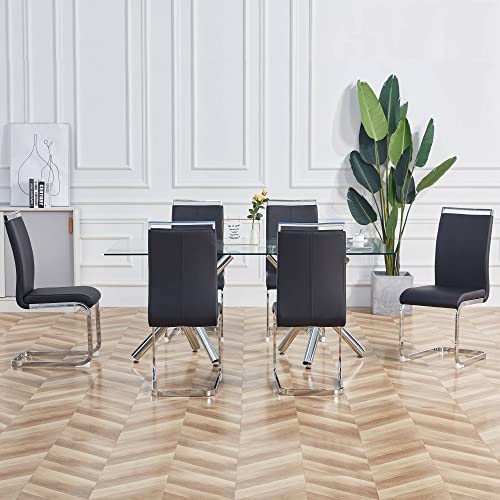 Modern 7-Piece Kitchen Table Set for 6 People, Space Saving Dining Room Table Set with 6 PU Upholstered Chairs Rectangular Black Imitation Marble Tempered Glass Dining Table Set for Living Room