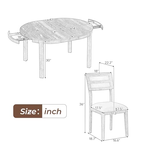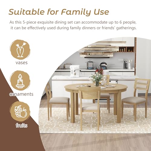 5-Piece Dining Table Set,Farmhouse Dining Set with Extendable Round Table, Modern Space Saving Kitchen Table with Upholstered Dining Chairs for Living Room,Natural Wood Wash