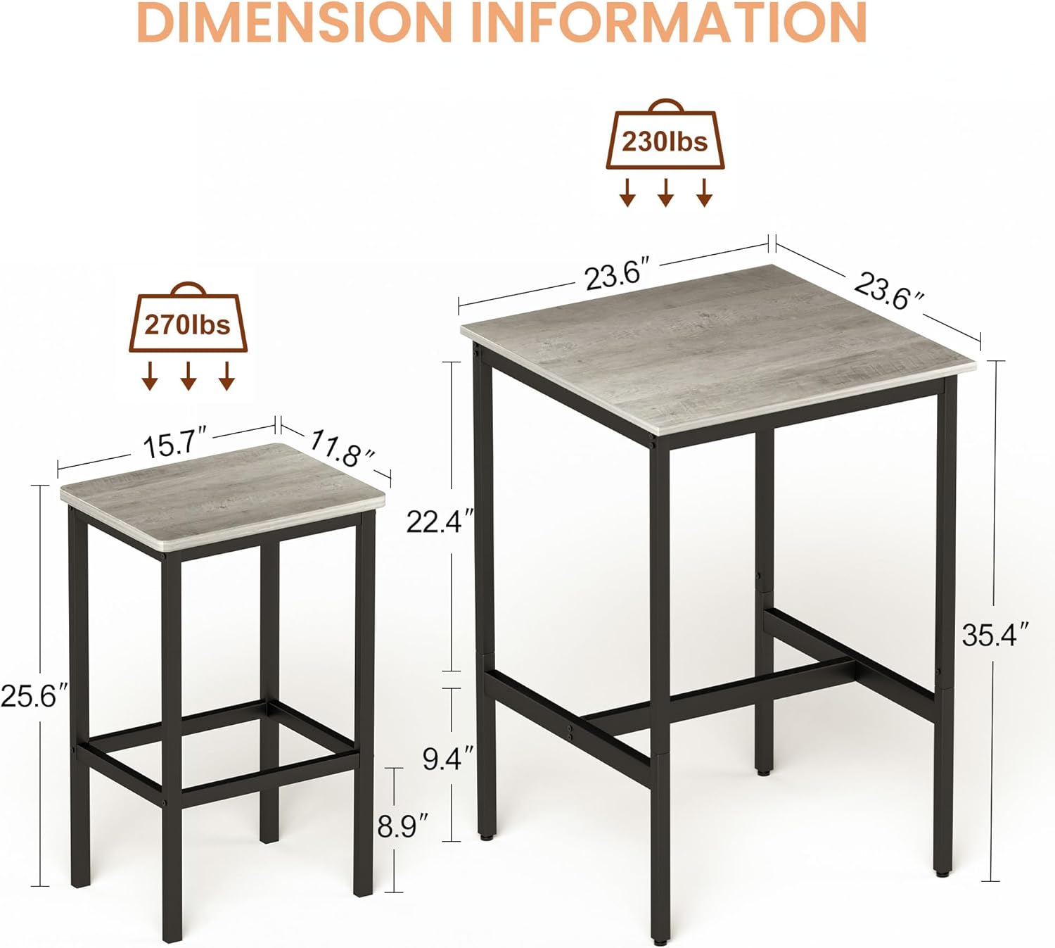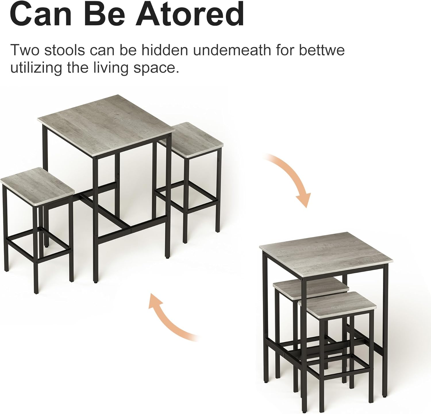 Bar Table Set, Square Bar Table with 2 Bar Chairs, Industrial Style Bar Chairs for Kitchen Breakfast Table, Bar, Living Room, Banquet Hall, Space Saving, Rustic Gray and Black, Grey