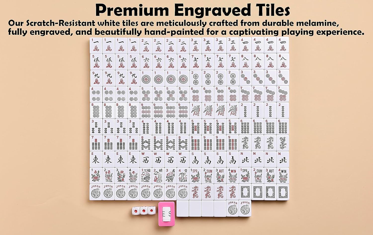 American Mahjong Game Set 166 White Engraved Tiles for Western Mah Jong, Mah jongg Play with Traveler Size Carrying Case, Dices, Chips, Manual,Win indicator. / Racks and Pushers not included