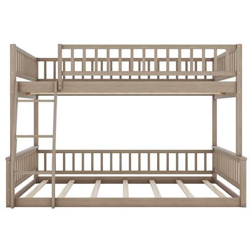 Wood Full XL over Queen Bunk Bed with Ladder and Guardrails,for Kids Teens Adults Bedroom Use (Walnut@Ladder, Full Over Queen)