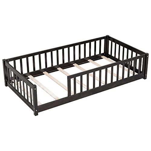 Twin Wood Bed Frame with Safety Fence, Espresso, No Box Spring Needed, Montessori Floor Bed for Kids