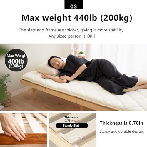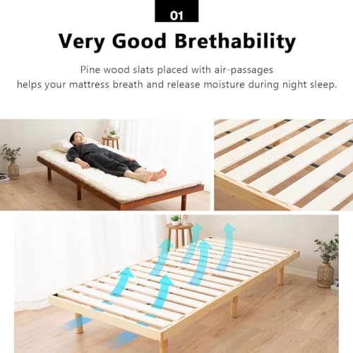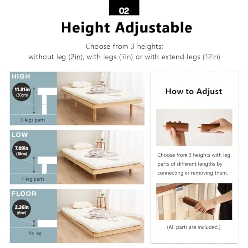 EMOOR Solid Wood Durable Slatted Bed with Headboard Twin (Earth-Natural), for Japanese Futon Mattress Pine Paulownia Height Adjustable