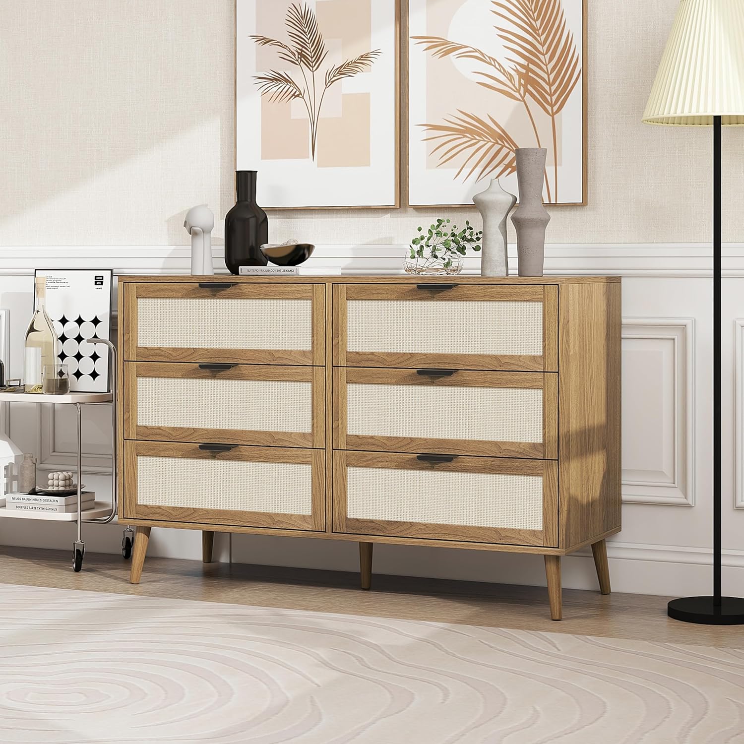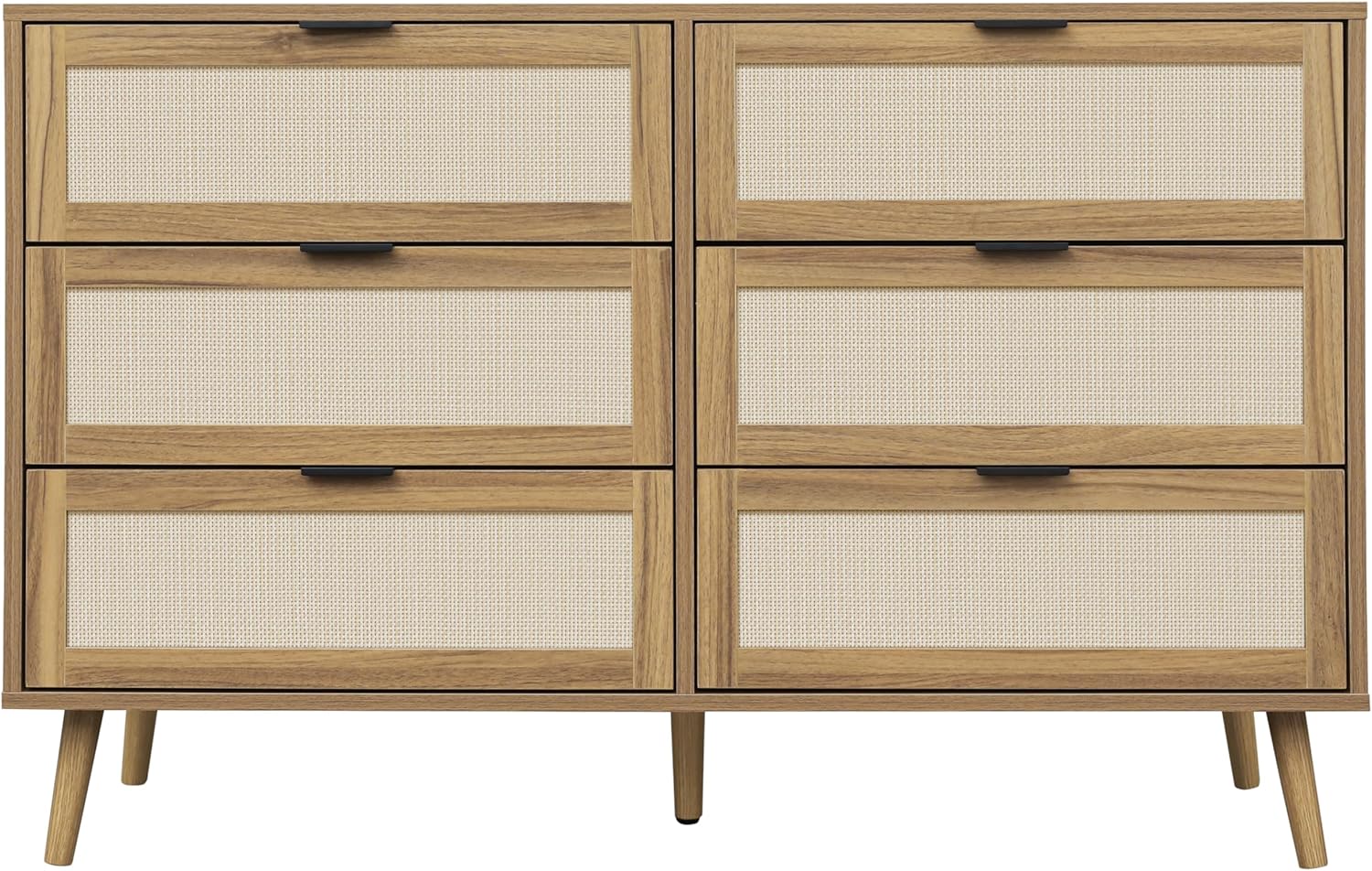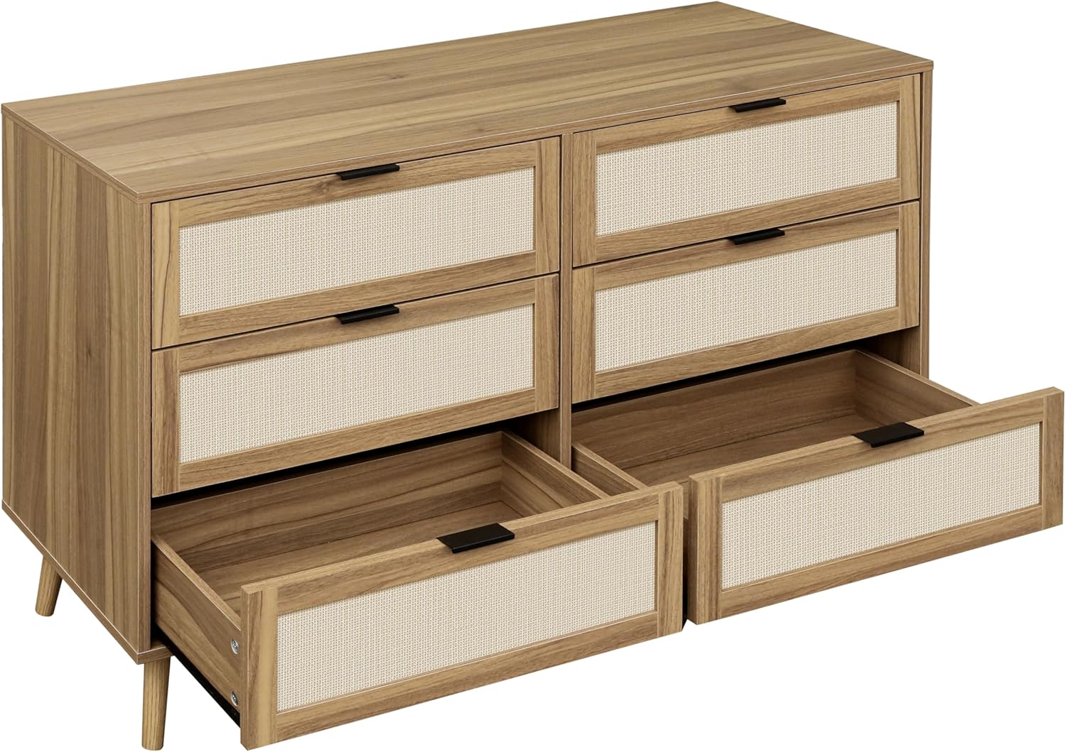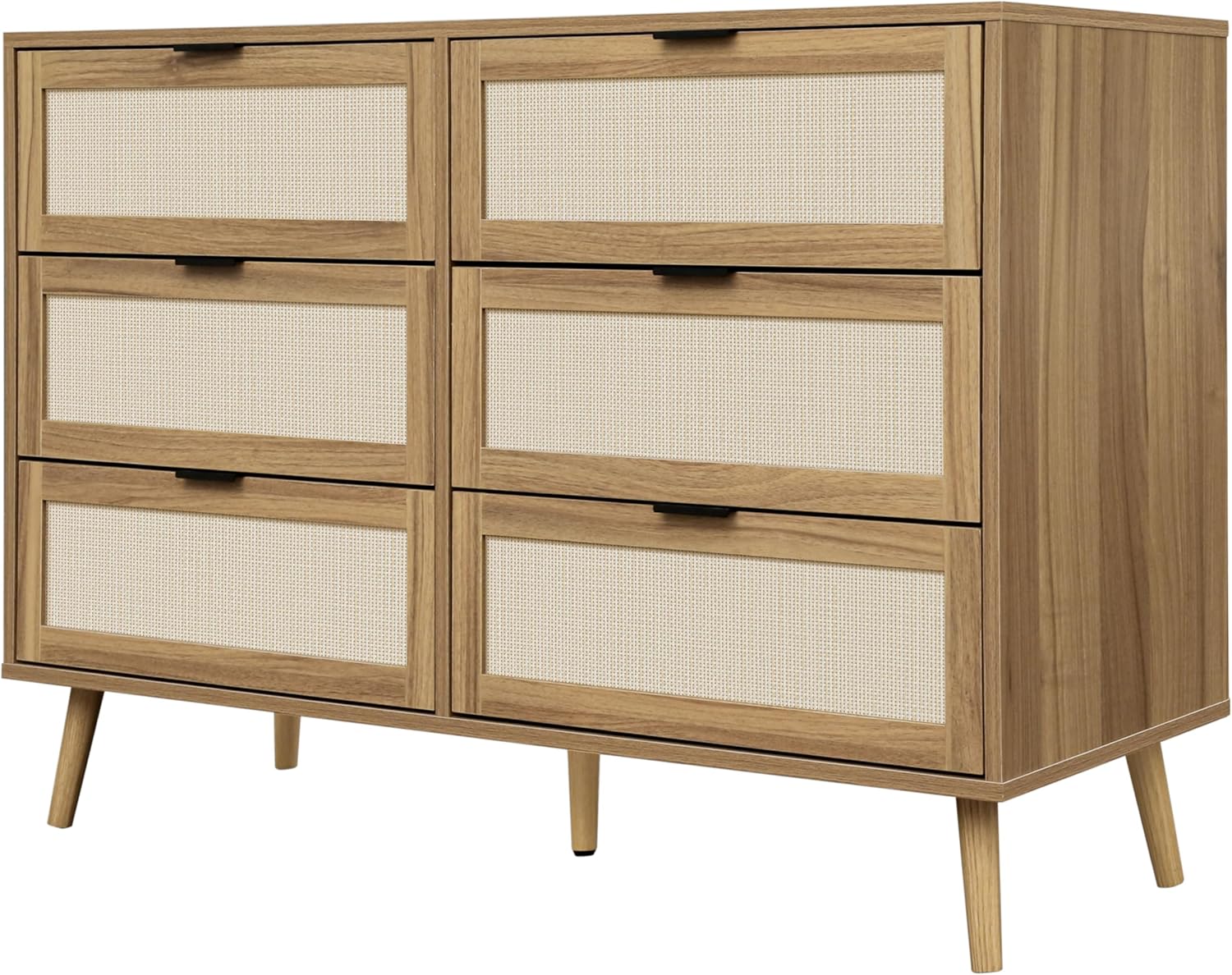 Dresser,Modern Cannage Rattan Chest with 6 Drawers,Wood Storage Cabinet Sideboard for Bedroom, Living Room, Entryway, Hallway(Walnut)