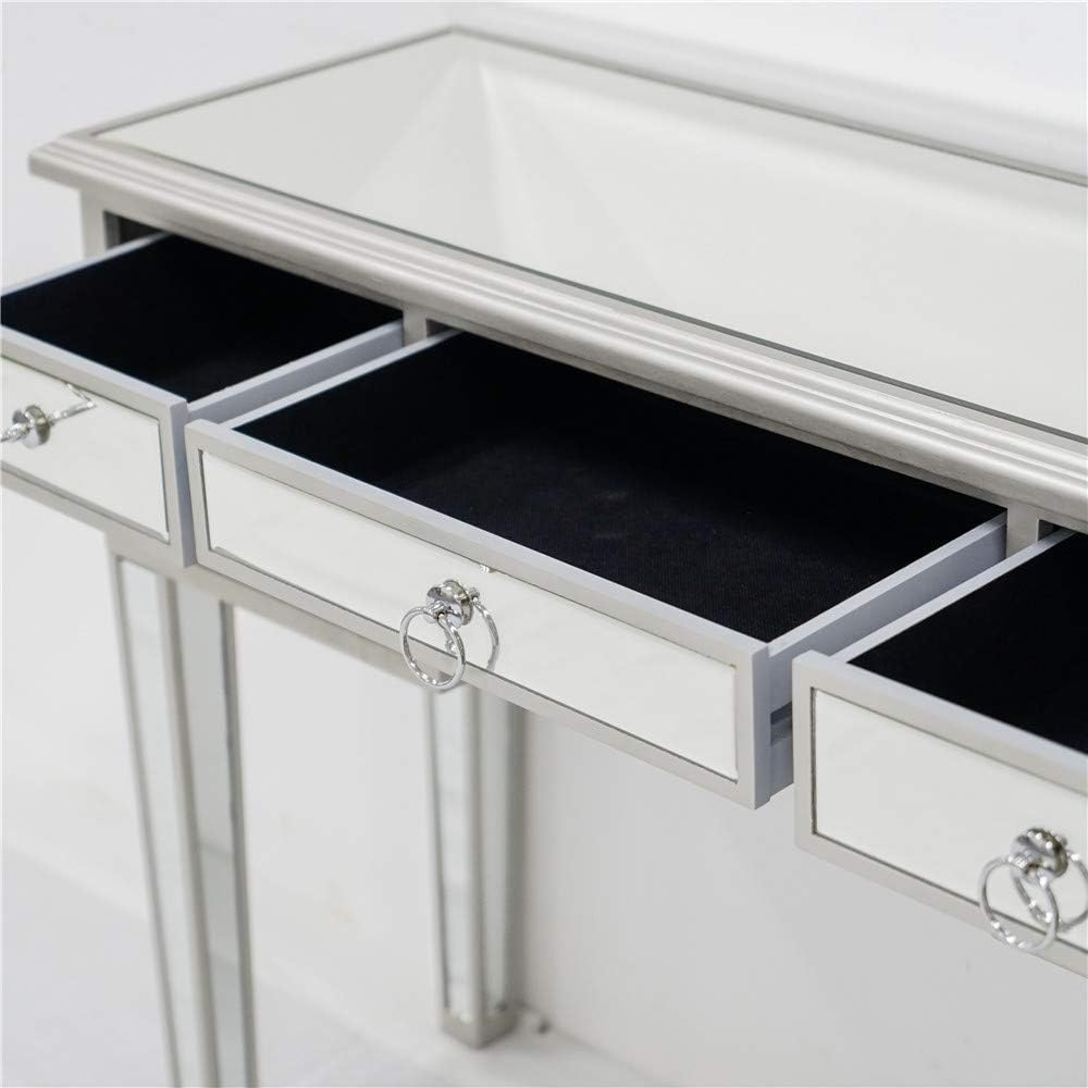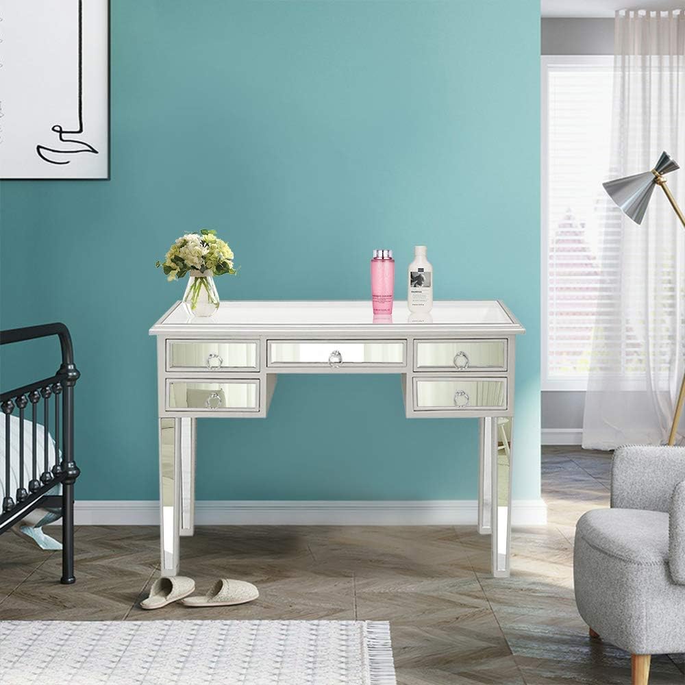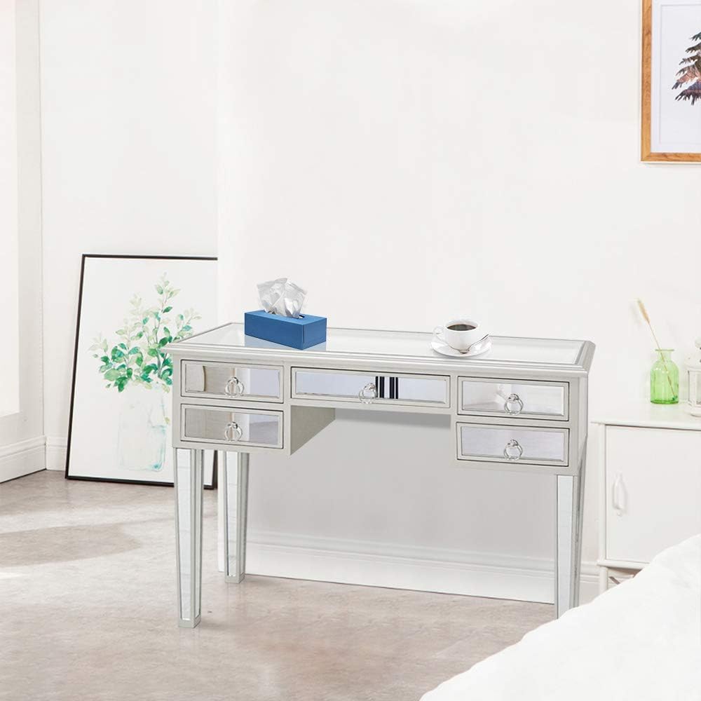 Goujxcy Mirrored Desk Console Table,Unique Modern Decorative Design Mirrored Desk Home Console Table Bedroom Vanity Make-up Table with 5 Drawer,Silver