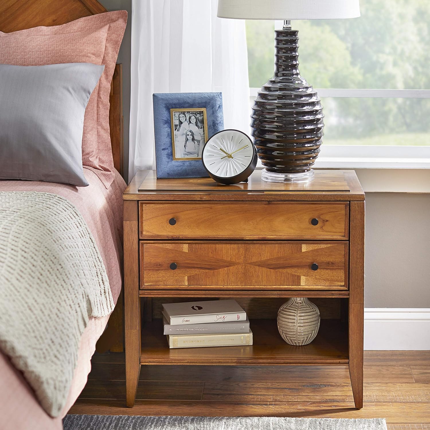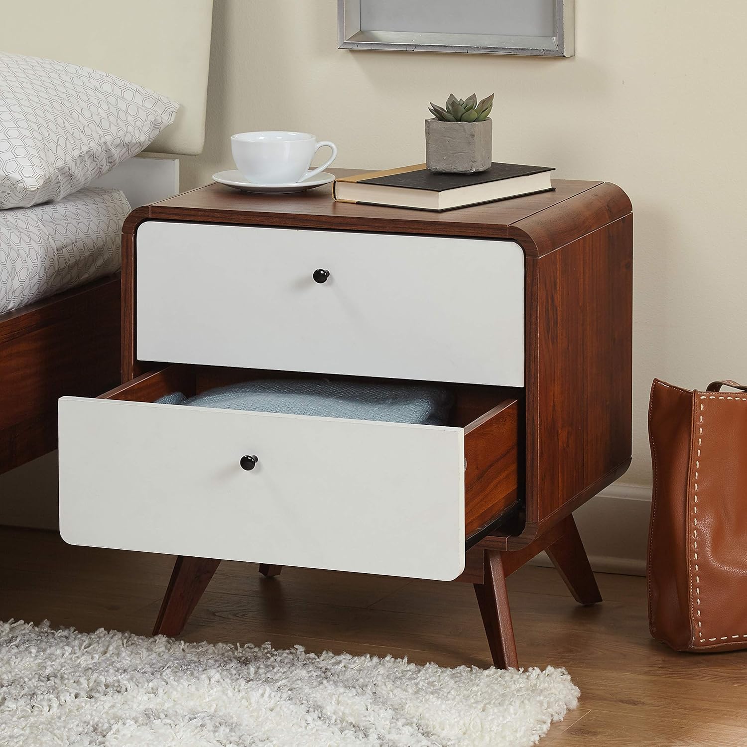 Cassie Mid Century Modern Two Drawer Bedroom Nightstand, 20.25", Walnut/White