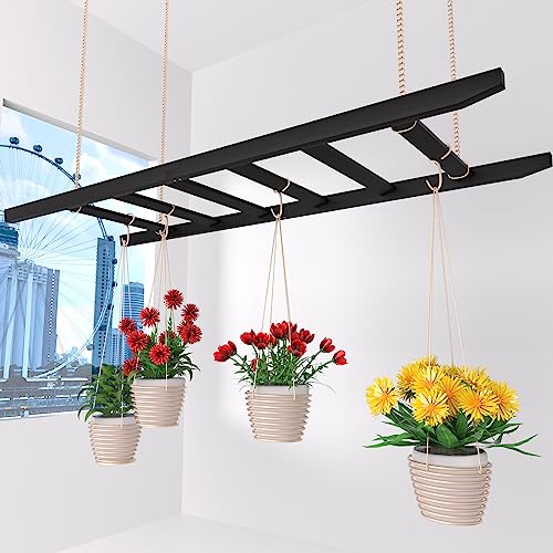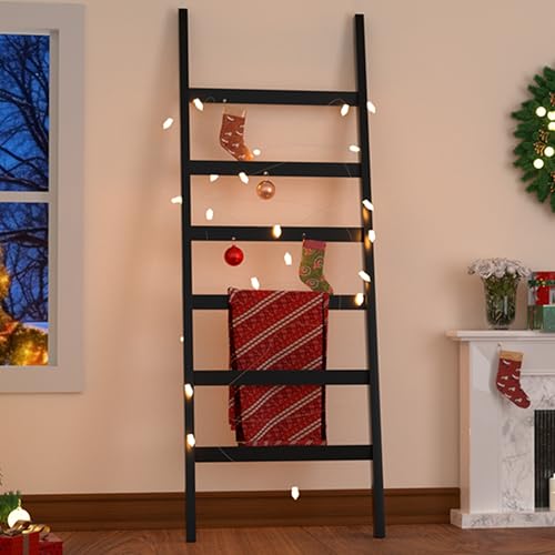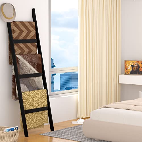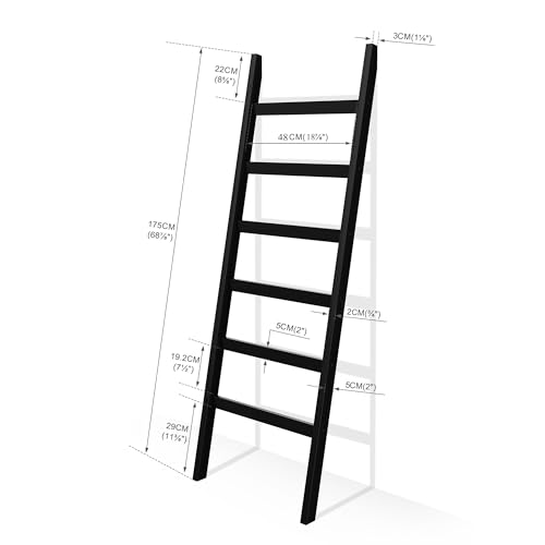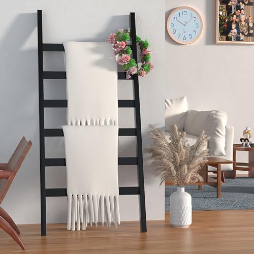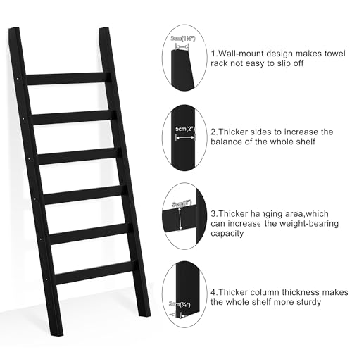 Blanket Ladder, 6 Tier Blanket Holder, 68.9 Inch Tall Blanket Rack, Ladder Shelf Against The Wall, Rustic Bamboo Quilt Rack Stand for Bathroom, Living Room, Bedroom, Balcony, Black