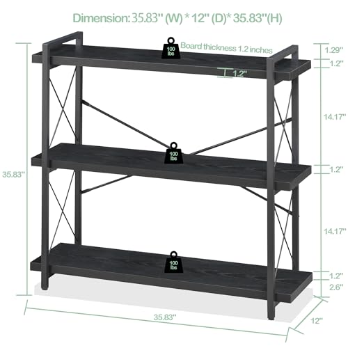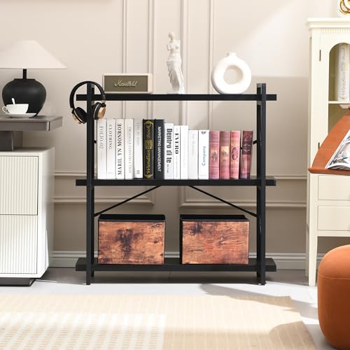 HCHQHS Bookshelf, 3-Tier Industrial Bookcase, Rustic Open Book Shelf, Freestanding Horizontal Bookshelves with Metal Frame